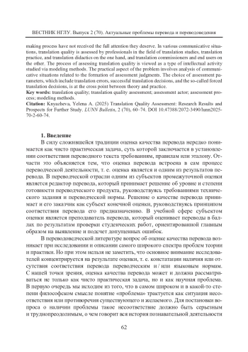 11. Княжева Е. А. Оценка качества перевода как вид интеллектуальной деятельности и методы ее исследования // Вестник Московского государственного лингвистического университета. Гуманитарные науки. 2024b. № 5 (886). С. 48-55. EDN: TBQNQM