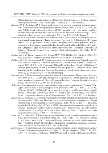 8. Кашкин В. Б., Княжева Е. А. Концептуализация перевода в обыденном сознании и научном представлении // Вестник Воронежского государственного университета. Серия Лингвистика и межкультурная коммуникация. 2010. № 1. С. 136-141.