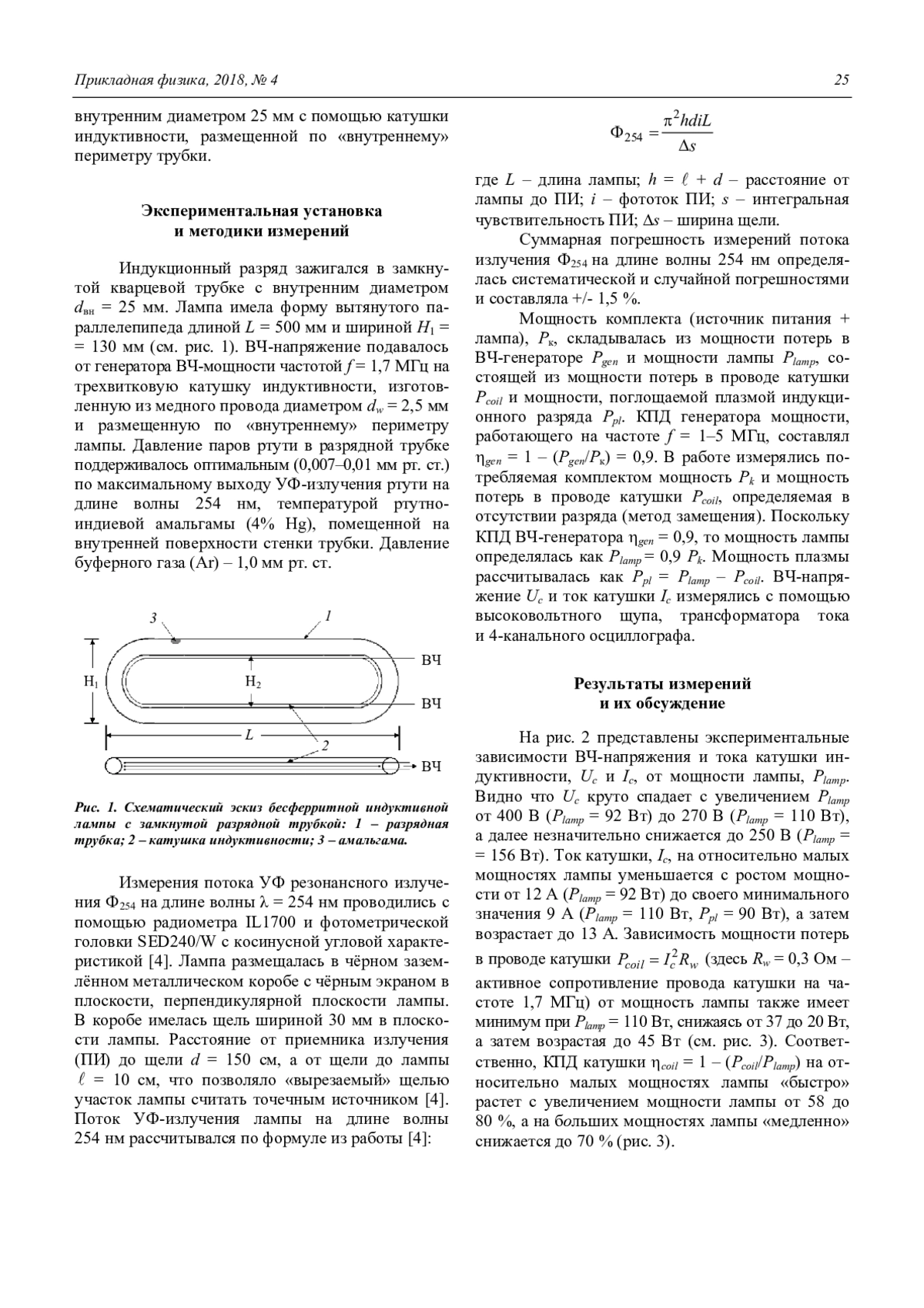 Проведено экспериментальное исследование электрических и излучательных характеристик ртутного бесферритного индуктивного разряда в лампе, образованной замкнутой кварцевой трубкой с внутренним диаметром dвн = 25 мм. Разряд возбуждался на частоте f = 1,7 МГц в смеси паров ртути (~10-2 мм рт. ст.) и аргона (1,0 мм рт. ст.) с помощью трехвитковой индуктивной катушки, размещенной по «внутреннему» периметру лампы длиной 500 мм и высотой 130 мм. Измерения, проведенные в интервале мощности плазмы Рpl = 52–112 Вт, показали, что ток катушки индуктивности Ic, мощность потерь в проводе катушки Pcoil, и средняя по сечению разрядной трубки напряженность ВЧ электрического поля в плазме Ēpl, минимальны, а разрядный ток лампы Ipl и КПД генерации УФ-излучения лампы на длине волны 254 нм ηlamp = Ф254/Рlamp максимальны при мощности плазмы Ppl = 85–90 Вт. Поток УФ-излучения лампы Ф254 и КПД генерации УФ-излучения плазмы ηpl = Ф254/Рpl возрастают практически линейно с увеличением мощности плазмы от 28 до 72 Вт и от 0,52 до 0,65 соответственно.