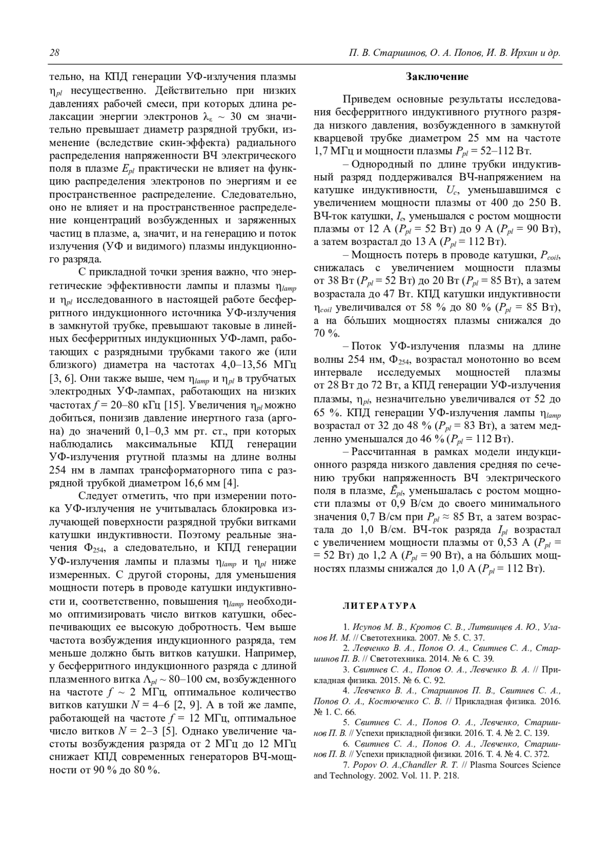 Старшинов П. В., Попов О. А., Ирхин И. В., Левченко В. А., Васина В. Н. Характеристики бесферритного индуктивного ртутного разряда низкого давления в замкну-той кварцевой трубке 24