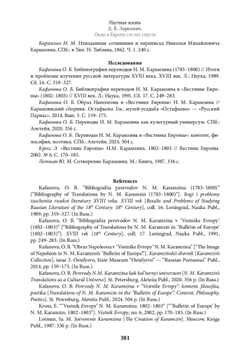 4. Кафанова О. Б. Библиография переводов Н. М. Карамзина в “Вестнике Европы” (1802-1803) // XVIII век. Л.: Наука, 1991. Сб. 17. С. 249-283.
