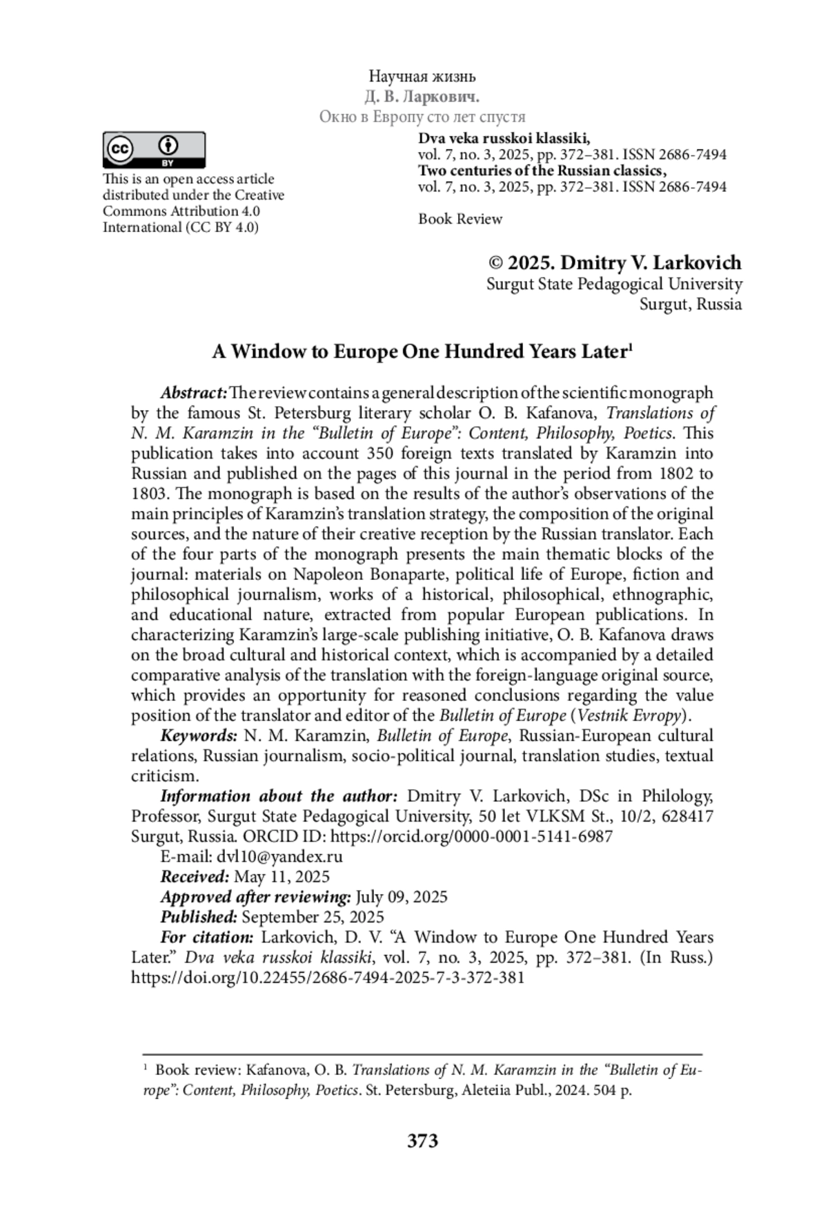 7. Кафанова О. Б. Переводы Н. М. Карамзина в “Вестнике Европы”: контент, философия, поэтика. СПб.: Алетейя, 2024. 504 с.