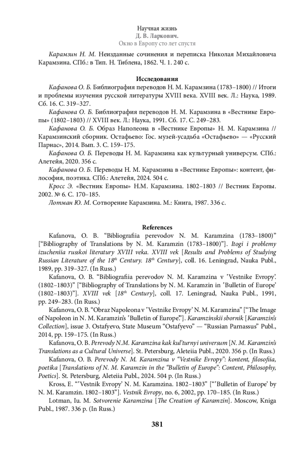 6. Кафанова О. Б. Переводы Н. М. Карамзина как культурный универсум. СПб.: Алетейя, 2020. 356 с.