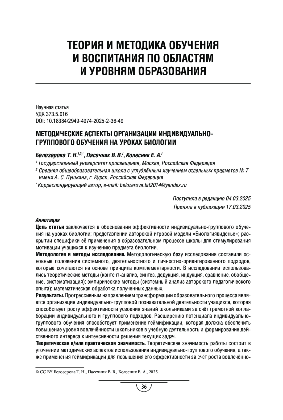 3. Белозерова Т. Н. Организация индивидуально-групповой учебно-познавательной деятельности учащихся в классах с углублённым изучением биологии // Развитие естественных наук и образования в России. Химия, биология, география, экология, образование: материалы Всероссийской научно-практической конференции памяти учёного-энциклопедиста Д. И. Менделеева (Москва, 16 февраля 2024 года). М.: ГУП, 2024. С. 191-194. EDN: PXPFBD