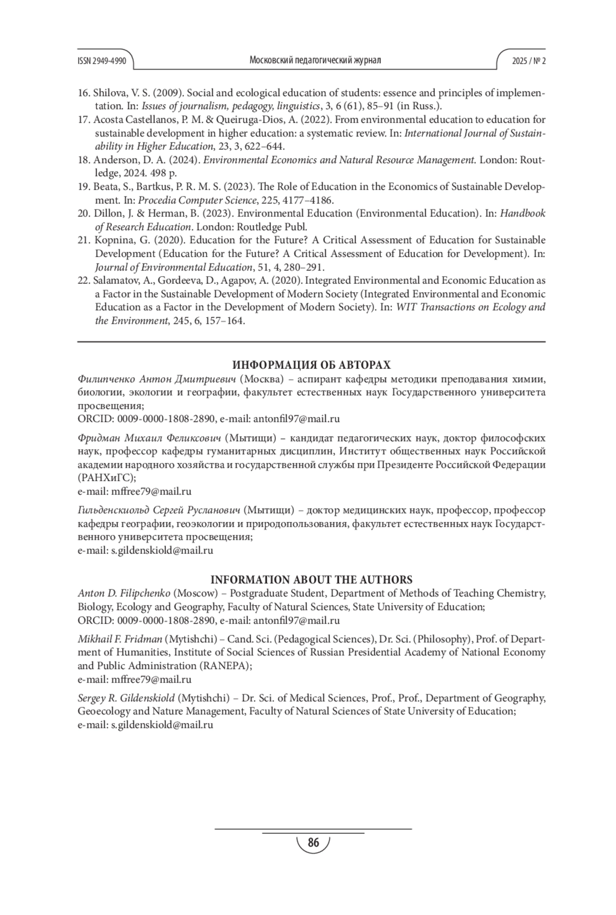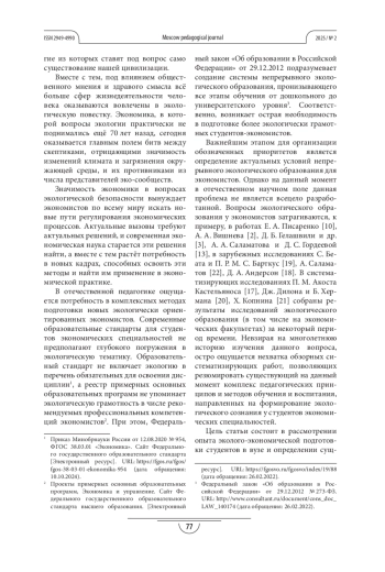 Теоретическая и/или практическая значимость. Теоретическое значение состоит в том, что раскрыта сущность понятий «эколого-экономическая подготовка», «экологическое сознание», «зелёная» экономика; предложены рекомендации по совершенствованию педагогических принципов и методов эколого-экономического образования. Результаты исследования. По итогам обзора существующей литературы и обобщения педагогического опыта в исследуемой области были сформулированы ключевые понятия эколого-экономического образования студентов-экономистов, в том числе понятия «экологического сознания» и «зелёной экономики»; проведена классификация компетенций в области «зелёной» экономики; выделены два комплекса мер по внедрению принципов «зелёной» экономики в процесс обучения студентов экономических специальностей; определены и перечислены ключевые принципы социально-экологического образования.