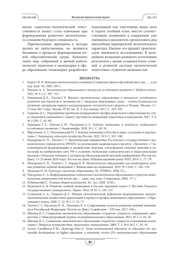 Цель работы состоит в рассмотрении научно-практического опыта эколого-экономической подготовки студентов экономических специальностей, определении сущности ключевых педагогических понятий эколого-экономического образования, раскрытии методов и принципов такой подготовки. Актуальность исследования объясняется необходимостью сформировать устойчивую систему подготовки студентов экономических направлений с уклоном в сторону «зелёной» экономики в связи с новыми экологическими требованиями к ведению экономической деятельности. В настоящий момент наблюдается неразработанность данной проблемы в отечественном научно-педагогическом поле.