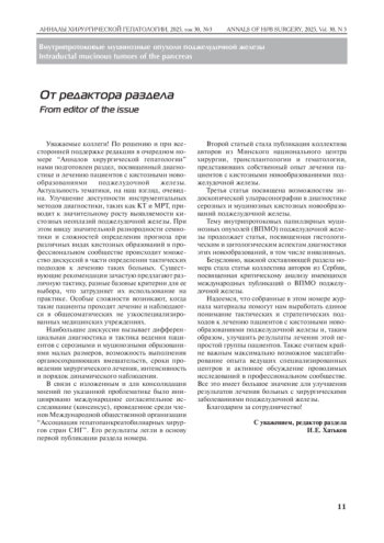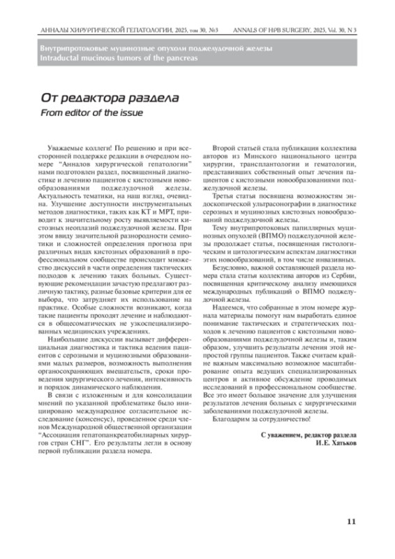 Уважаемые коллеги! По решению и при всесторонней поддержке редакции в очередном номере “Анналов хирургической гепатологии” нами подготовлен раздел, посвященный диагностике и лечению пациентов с кистозными новообразованиями поджелудочной железы. Актуальность тематики, на наш взгляд, очевидна. Улучшение доступности инструментальных методов диагностики, таких как КТ и МРТ, приводит к значительному росту выявляемости кистозных неоплазий поджелудочной железы. При этом ввиду значительной разнородности семиотики и сложностей определения прогноза при различных видах кистозных образований в профессиональном сообществе происходит множество дискуссий в части определения тактических подходов к лечению таких больных. Существующие рекомендации зачастую предлагают различную тактику, разные базовые критерии для ее выбора, что затрудняет их использование на практике. Особые сложности возникают, когда такие пациенты проходят лечение и наблюдаются в общесоматических не узкоспециализированных медицинских учреждениях.