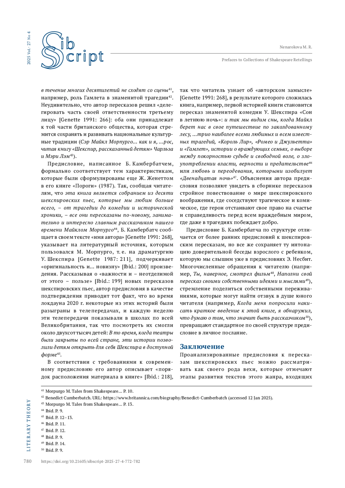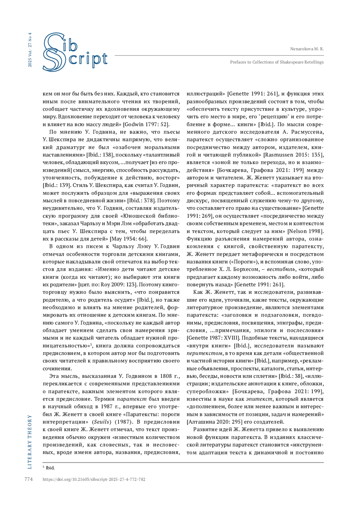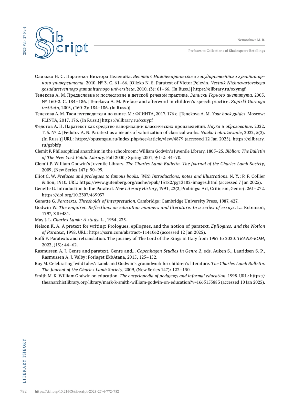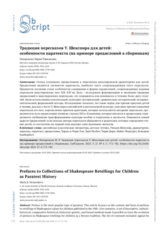 НЕНАРОКОВА М. Р. ТРАДИЦИЯ ПЕРЕСКАЗОВ У. ШЕКСПИРА ДЛЯ ДЕТЕЙ: ОСОБЕННОСТИ ПАРАТЕКСТА (НА ПРИМЕРЕ ПРЕДИСЛОВИЙ К СБОРНИКАМ) // СИБСКРИПТ. 2025. Т. 27, № 4
