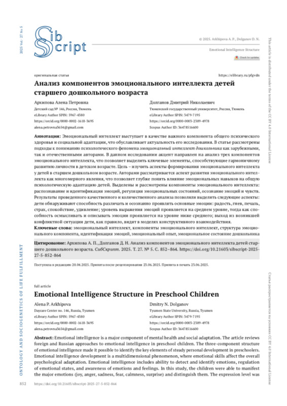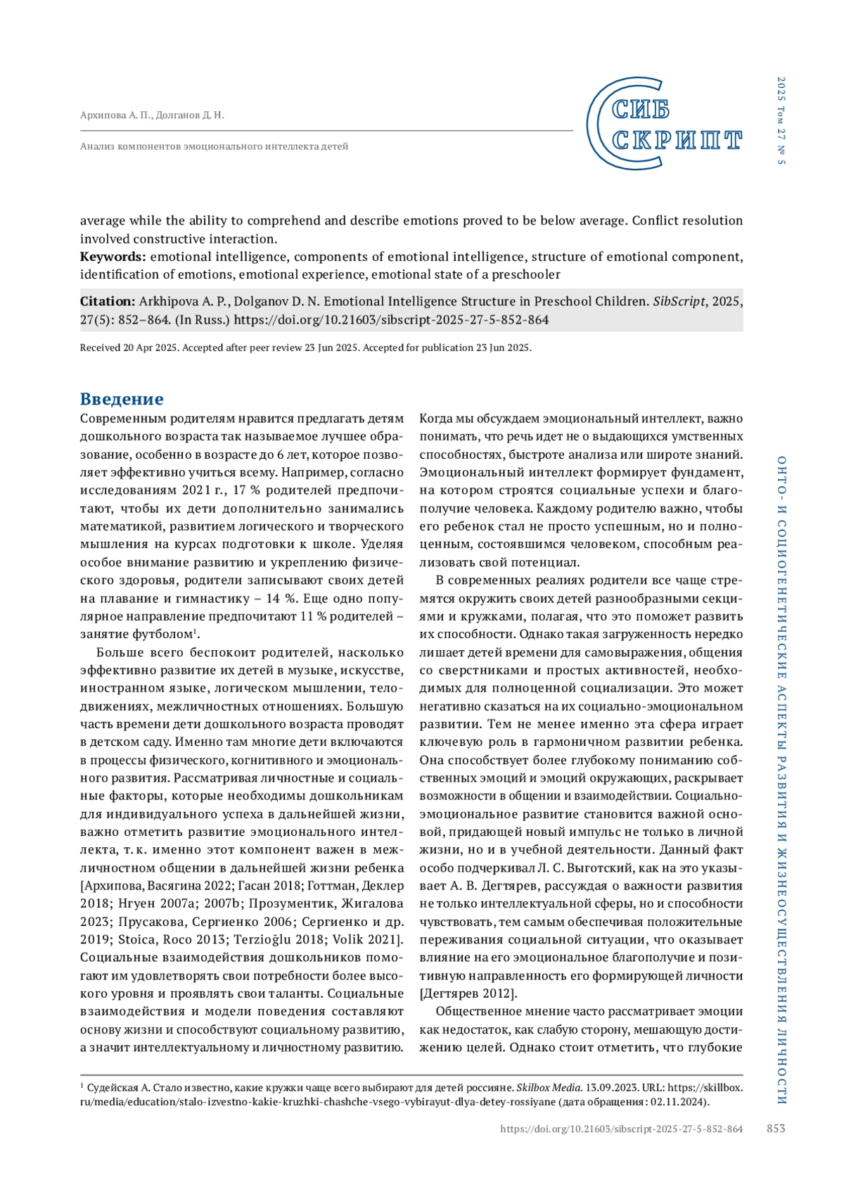 Эмоциональный интеллект выступает в качестве важного компонента общего психического здоровья и социальной адаптации, что обуславливает актуальность его исследования. В статье рассмотрены подходы к пониманию психологического феномена эмоциональный интеллект дошкольника как зарубежными, так и отечественными авторами. В данном исследовании акцент направлен на анализ трех компонентов эмоционального интеллекта, что позволяет выделить ключевые элементы, способствующие гармоничному развитию личности в детском возрасте. Цель – изучить аспекты формирования эмоционального интеллекта у детей в старшем дошкольном возрасте. Авторами рассматривается аспект развития эмоционального интеллекта как многомерного явления, что позволяет глубже понять влияние эмоциональных навыков на общую психологическую адаптацию детей. Выделены и рассмотрены компоненты эмоционального интеллекта: распознавание и идентификация эмоций, регуляция эмоциональных состояний, осознание эмоций и чувств. Результаты проведенного качественного и количественного анализа позволили выделить следующие аспекты: дети обнаруживают способность различать и осознанно проявлять основные эмоции: радость, гнев, печаль, страх, спокойствие, удивление; уровень выражения эмоций проявляется на среднем уровне, тогда как способность осмысливать и описывать эмоции проявляется на уровне ниже среднего; выход из возникшей конфликтной ситуации дети, как правило, видят в моделях конструктивного взаимодействия.