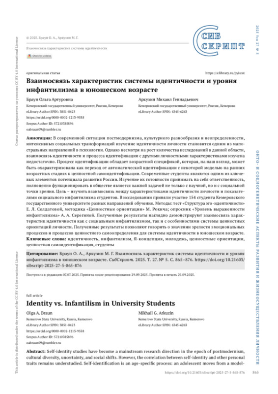 В современной ситуации постмодернизма, культурного разнообразия и неопределенности, интенсивных социальных трансформаций изучение идентичности личности становится одним из магистральных направлений в психологии. Однако несмотря на рост количества исследований в данной области, взаимосвязь идентичности и процесса идентификации с другими личностными характеристиками изучена недостаточно. Процесс идентификации обладает возрастной спецификой, которая, на наш взгляд, может быть охарактеризована как переход от автоматической идентификации с некоторой моделью на ранних возрастных стадиях к ценностной самоидентификации. Современные студенты являются одним из ключевых элементов потенциала развития России. Изучение их готовности принимать на себя ответственность, полноценно функционировать в обществе является важной задачей не только с научной, но и с социальной точки зрения. Цель – изучить взаимосвязь между характеристиками идентичности личности и показателями социального инфантилизма студентов. В исследовании приняли участие 154 студента Кемеровского государственного университете разных направлений обучения. Методы: тест «Структура эго-идентичности» Е. Л. Солдатовой, методика «Ценностные ориентации» М. Рокича; опросник «Уровень выраженности инфантилизма» А. А. Серегиной. Полученные результаты наглядно демонстрируют взаимосвязь характеристик идентичности как с социальным инфантилизмом, так и с особенностями системы ценностных ориентаций личности. Полученные результаты позволяют говорить о значении зрелости эмоциональных процессов и процессов ценностного самоопределения для системы идентичности в юношеском возрасте.