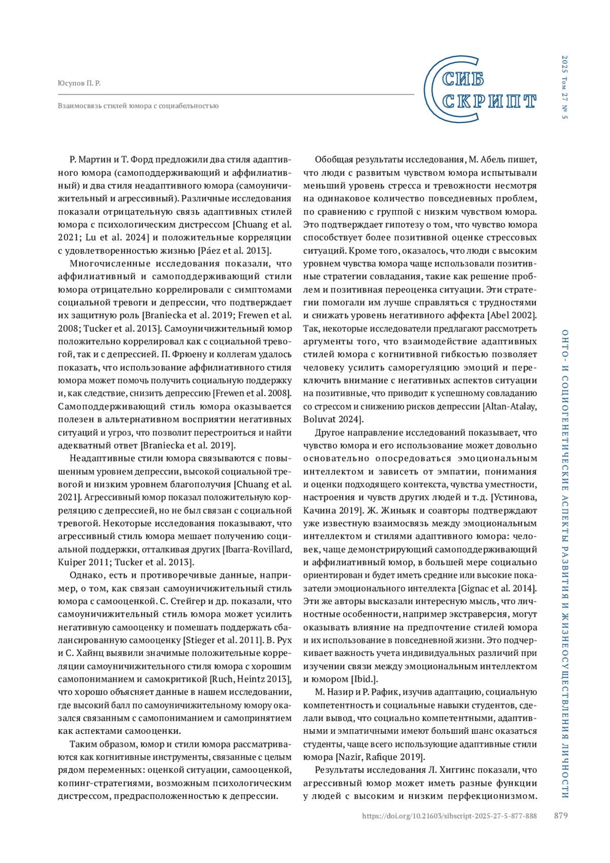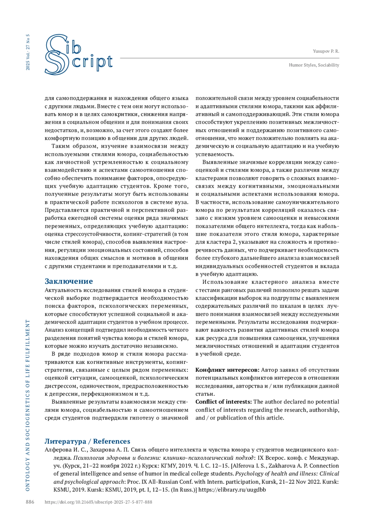 Подчеркивается необходимость четкого разделения понятий чувства юмора и стилей юмора, которые могут представлять единую систему, но изучать эти феномены можно достаточно независимо. Цель – выявить взаимосвязи между используемыми стилями юмора, социабельностью как личностной устремленностью к социальному взаимодействию и аспектами самоотношения на студенческой выборке. Выборку составили 48 студентов медицинского вуза в возрасте 18–24 лет. Применены: опросник стилей юмора Р. Мартина; методика диагностики социабельности личности; тест-опросник самоотношения; прогрессивные матрицы Равена. Использованы методы корреляционного, кластерного анализа, анализ сравнения средних. Стили юмора сближаются с понятиями когнитивных инструментов, стратегий работы с информацией, копинг-стратегий, помогающих снижать когнитивную / эмоциональную уязвимость перед стрессами. Проанализированы исследования, изучающие взаимосвязь стилей юмора с целым рядом переменных: оценкой ситуации, когнитивной гибкостью, эмоциональным интеллектом, самооценкой, психологическим дистрессом, одиночеством, предрасположенностью к депрессии, перфекционизмом. Результаты исследования подтверждают, что использование адаптивных стилей юмора может быть связано с хорошей стрессовой устойчивостью, средним или высоким эмоциональным интеллектом, когнитивной гибкостью, верой в персональный успех, направленностью на общение и взаимодействие с другими, позитивным самоотношением и т. д. Неадаптивные стили юмора в целом чаще обнаруживают связь с психологическим дистрессом, когнитивной негибкостью, невысокой социабельностью, противоречивым самоотношением. Однако, результаты (как и результаты некоторых других исследований) скорее заставляют задуматься о сложной и противоречивой природе связей между использованием стилей юмора, ситуационным контекстом, личностными особенностями, мотивацией, способностью самоконтроля и т. д. Определена важность развития адаптивных стилей юмора как ресурса для повышения самооценки, улучшения межличностных отношений и адаптации студентов в учебной среде.
