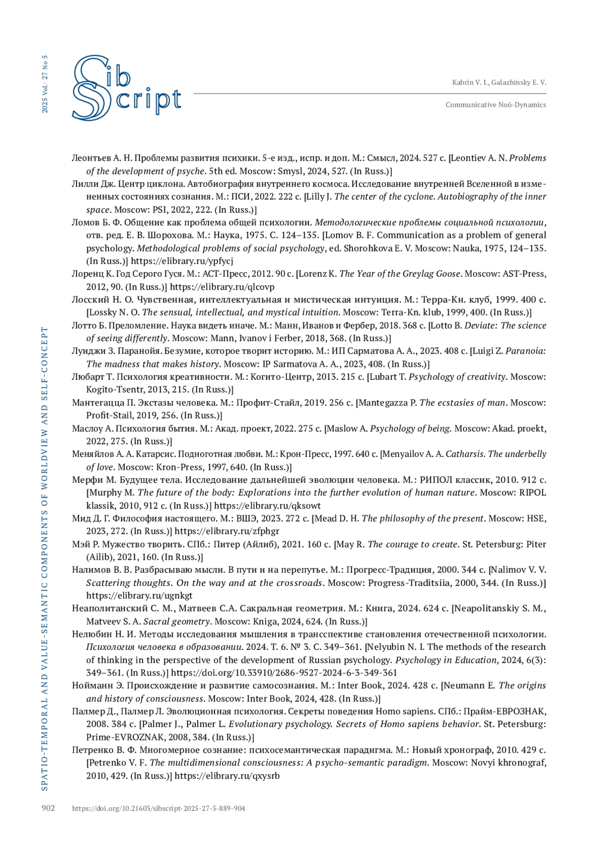 18. Кабрин В. И. Коммуникативная психосемантика когнитивно-ноэтического развития личности. Сибирский психологический журнал. 2022. № 85. С. 51-71. https://doi.org/10.17223/17267080/85/3