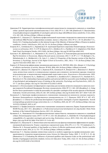 12. Кусакина Е. А. Критерии профессионального становления специалистов-кинологов силовых ведомств. Вестник Ленинградского государственного университета им. А. С. Пушкина. 2023. № 4. С. 457-473. https://doi.org/10.35231/18186653_2023_4_457