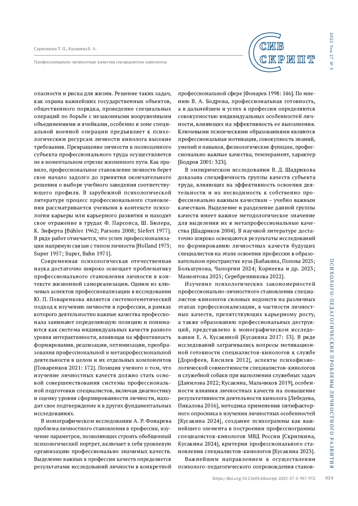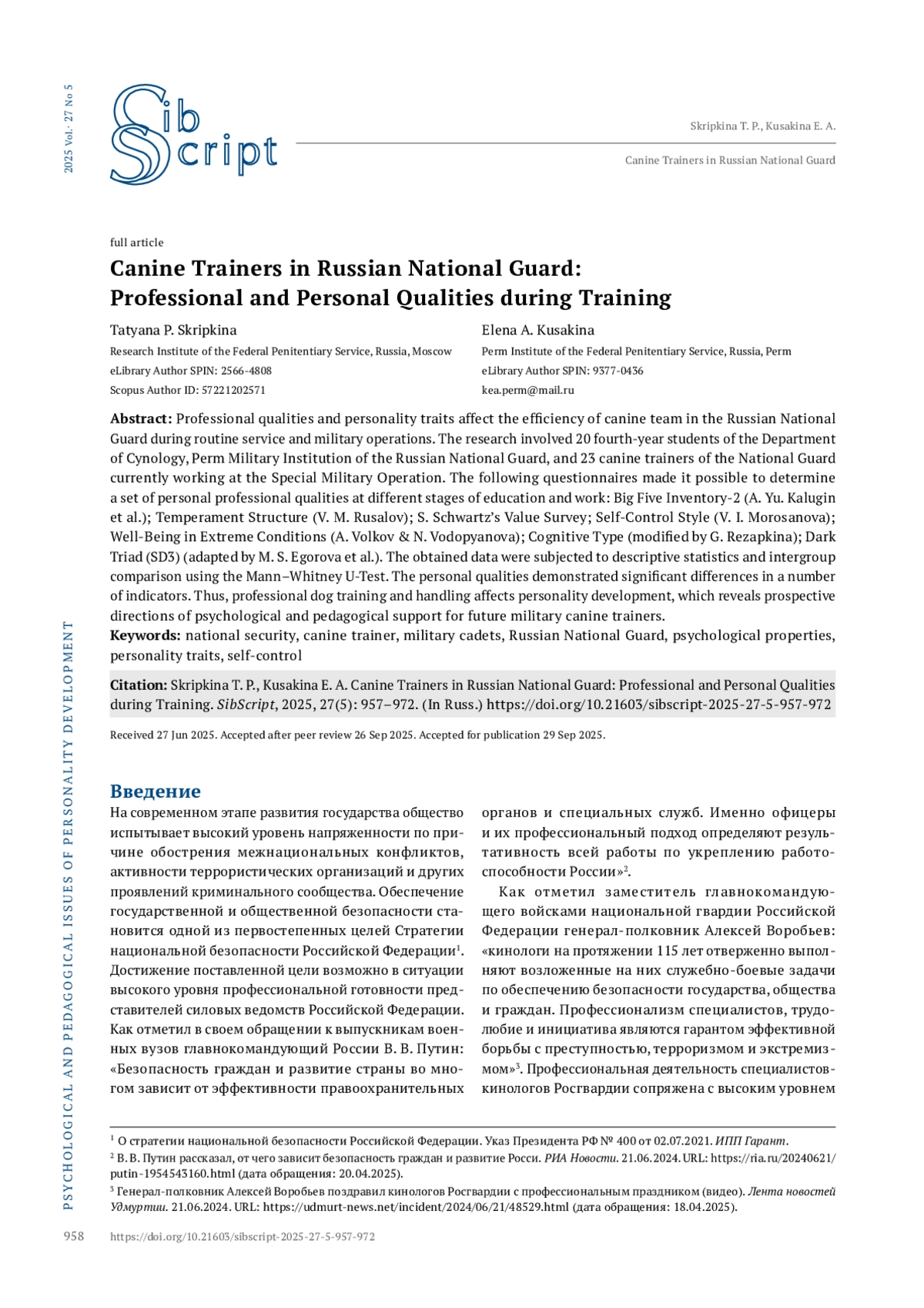 Рассмотрен один из важнейших компонентов психологической структуры субъекта профессиональной деятельности – качества и свойства личности на примере специалистов-кинологов Росгвардии, который влияет на эффективность выполнения поставленных служебно-боевых задач. Цель – определить в структуре личности необходимые профессионально важные и профессионально значимые качества специалистов-кинологов, находящихся на разных этапах профессионализации. Эмпирическое исследование позволило определить направления психолого-педагогического сопровождения в становлении личности профессионала. В нем приняли участие 20 курсантов 4 курса кинологического факультета Пермского военного института Росгвардии и 23 специалиста-кинолога (выполняющие служебно-боевые задачи в зоне специальной военной операции) Отдельной Краснознамённой дивизии оперативного назначения имени Ф. Э. Дзержинского войск национальной гвардии Российской Федерации. Использованы следующие методики: психометрика русскоязычной версии Big Five Inventory-2 (А. Ю. Калугин и др..); опросник структуры темперамента (В. М. Русалов); методика Ш. Шварца по изучению ценностных ориентаций; опросник «Стиль саморегуляции поведения ССП-98» (В. И. Моросанова); симптоматический опросник «Самочувствие в экстремальных условиях» (А. Волков, Н. Водопьянова); методика «Тип мышления» (модификация Г. Резапкиной); короткий опросник Темной триады (SD3) (адаптация М. С. Егоровой, М. А. Ситниковой, О. В. Паршиковой). Полученные данные подвергались описательной статистике и межгрупповому сравнению (использование U-критерия Манна-Уитни). В результате исследования установлено, что исследуемые свойства и качества в обеих группах респондентов имеют по ряду показателей значимые отличия, что свидетельствует о влиянии предметной деятельности на формирование личности профессионала и позволяет определить направления его психолого-педагогического сопровождения.