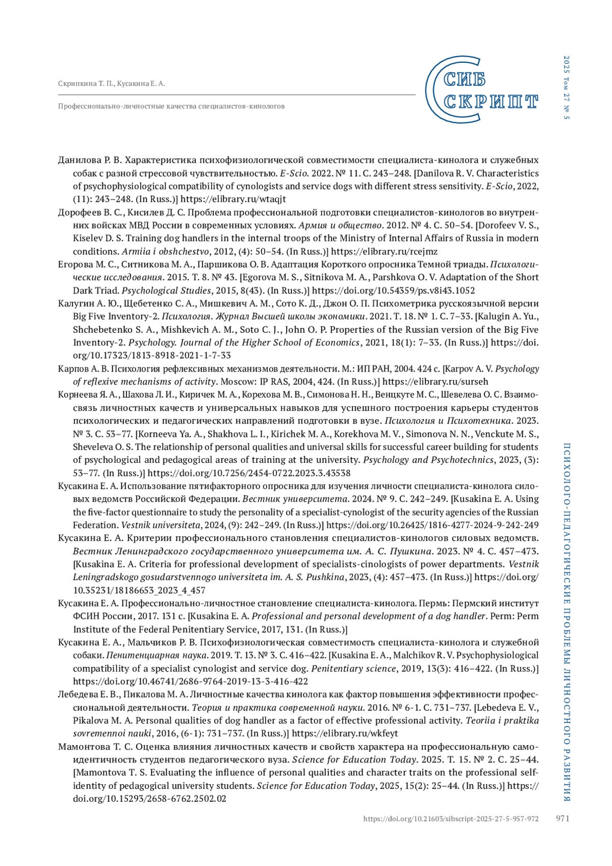 11. Кусакина Е. А. Использование пятифакторного опросника для изучения личности специалиста-кинолога силовых ведомств Российской Федерации. Вестник университета. 2024. № 9. С. 242-249. https://doi.org/10.26425/1816-4277-2024-9-242-249