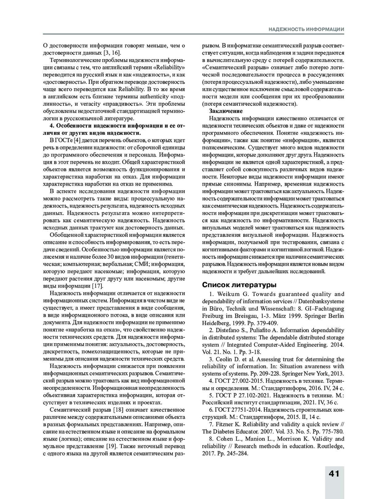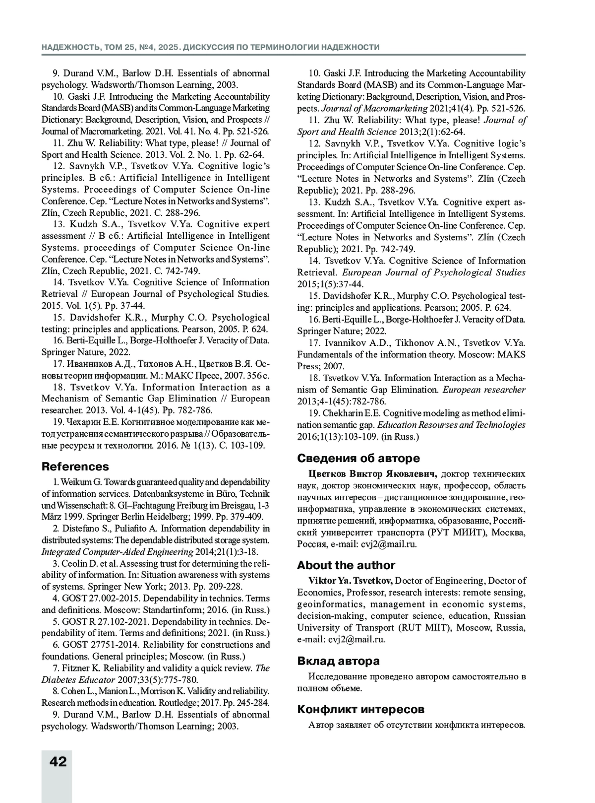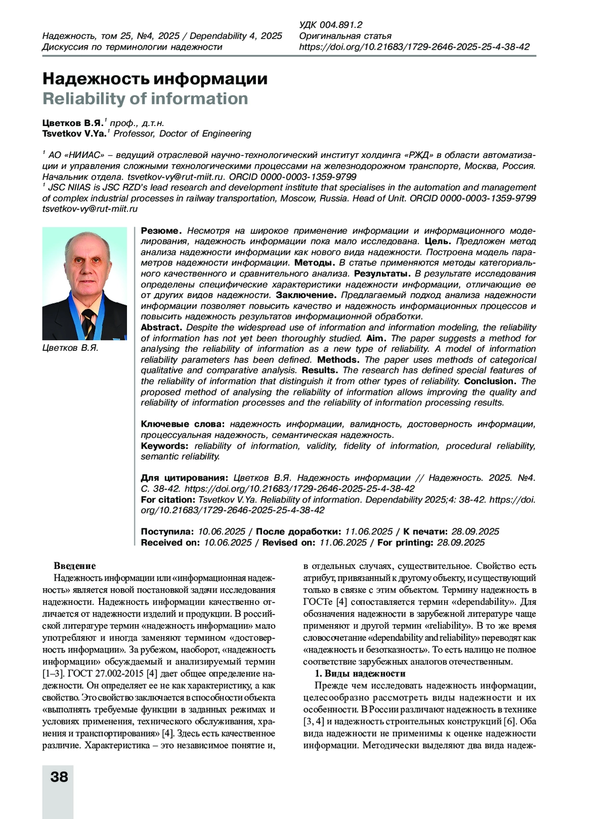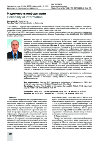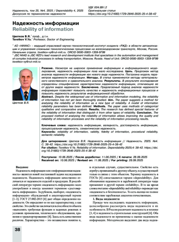 ЦВЕТКОВ В. Я. НАДЕЖНОСТЬ ИНФОРМАЦИИ // НАДЕЖНОСТЬ. 2025. ТОМ 25, № 4