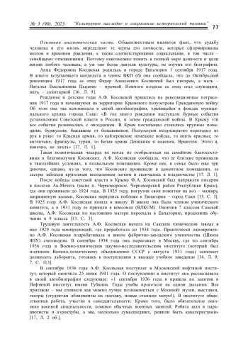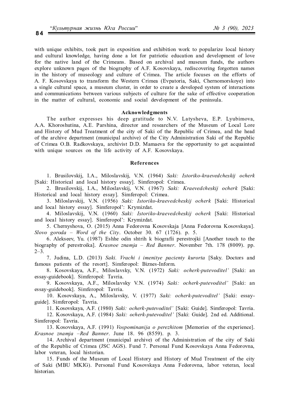В статье, на основании впервые вводимых в научный оборот источников из фондов Архивного отдела (муниципального архива) Администрации города Саки, Музея краеведения и истории грязелечения города Саки, рассматривается вклад Анны Федоровны Косовской (1917–2000) в развитие МБУ «Музей краеведения и истории грязелечения» г. Саки как института культуры и субъекта социокультурной деятельности. Огромный вклад в становление и развитие музея внесла А. Ф. Косовская, возглавлявшая его в 1955–1993 гг., и долгие годы – на общественных началах. Более 30 лет А. Ф. Косовская также работала экскурсоводом по Крыму, разрабатывала различные экскурсионно-туристические маршруты, являлась председателем общества по охране памятников г. Саки. Она активно пополняла фонды Музея краеведения и истории грязелечения уникальными экспонатами, принимала участие в экспозиционно-выставочной работе и популяризации краеведческих и культуроведческих знаний. В статье акцентируется внимание на усилиях А. Ф. Косовской по превращению Западного Крыма (Евпатория, Саки, пгт. Черноморское) в единое культурное пространство, музейный кластер, с целью создания развитой системы взаимодействий и коммуникаций между различными субъектами культуры ради эффективного сотрудничества в деле культурного, экономического и социального развития полуострова