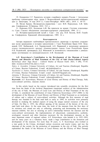 19. Кондратюк С.Г. Хранитель истории старейшего курорта России // Актуальные проблемы гуманитарных наук: труды V Всероссийской научно-практической конференции (г. Евпатория, 16 мая 2019 г.). Санкт-Петербург: МОО “ИС”, 2019. С. 49-55. EDN: JATBHL