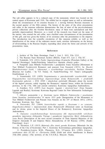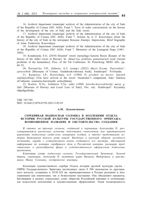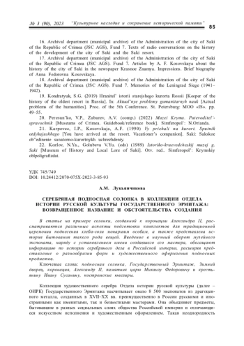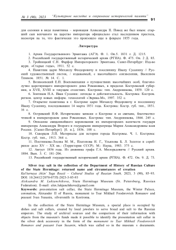 В статье на примере солонки, созданной к коронации Александра II, рассматриваются различные аспекты подготовки комплектов для традиционной церемонии поднесения хлеба-соли монаршим особам, а также представлена история бытования такого рода вещей. Введение в научный оборот музейного экспоната, наряду с установлением имени создавшего его мастера, обогащают информацию по истории серебряного дела в Российской империи, расширяя представление о разнообразии форм и художественного оформления подносных предметов