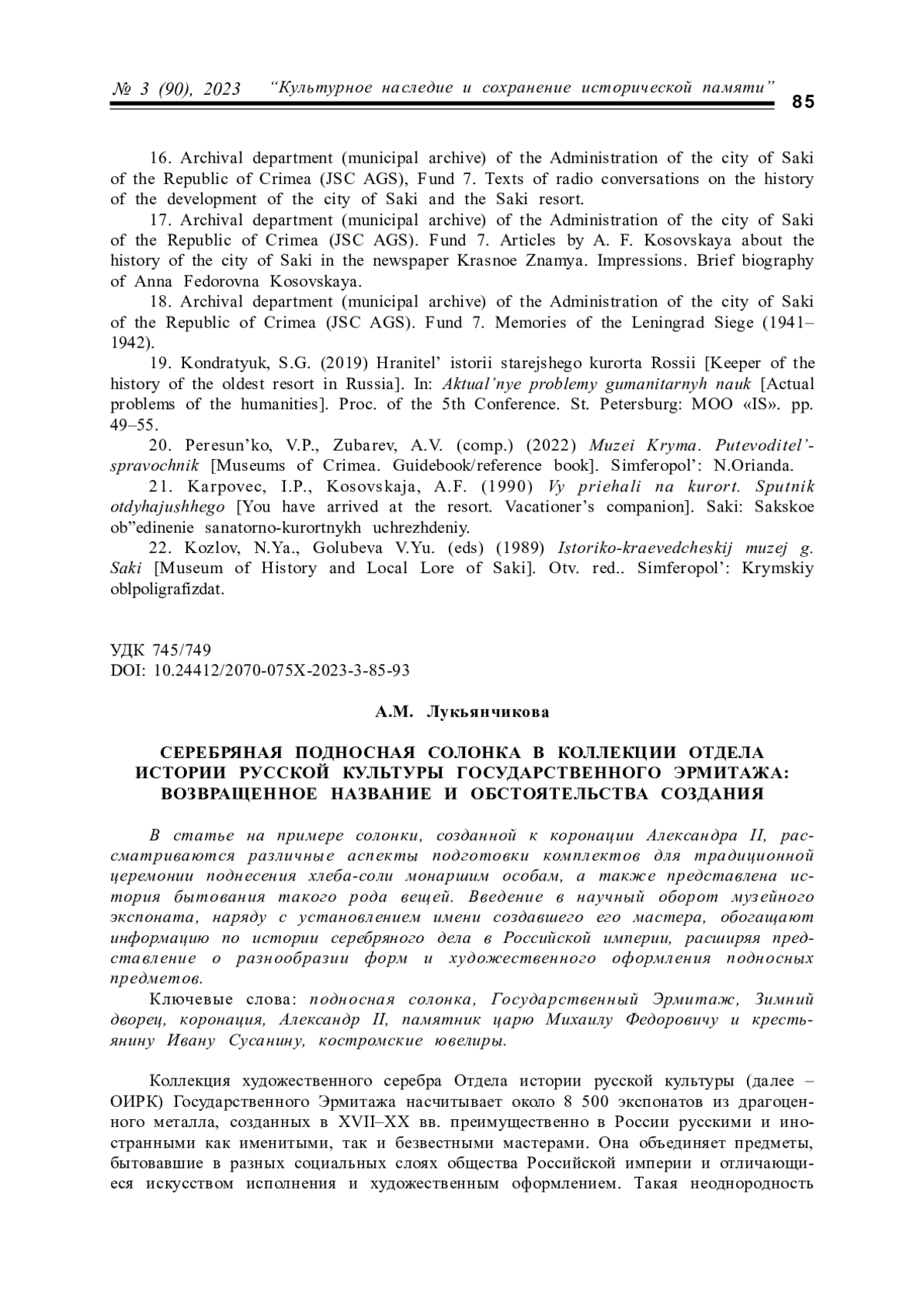 В статье, на основании впервые вводимых в научный оборот источников из фондов Архивного отдела (муниципального архива) Администрации города Саки, Музея краеведения и истории грязелечения города Саки, рассматривается вклад Анны Федоровны Косовской (1917–2000) в развитие МБУ «Музей краеведения и истории грязелечения» г. Саки как института культуры и субъекта социокультурной деятельности. Огромный вклад в становление и развитие музея внесла А. Ф. Косовская, возглавлявшая его в 1955–1993 гг., и долгие годы – на общественных началах. Более 30 лет А. Ф. Косовская также работала экскурсоводом по Крыму, разрабатывала различные экскурсионно-туристические маршруты, являлась председателем общества по охране памятников г. Саки. Она активно пополняла фонды Музея краеведения и истории грязелечения уникальными экспонатами, принимала участие в экспозиционно-выставочной работе и популяризации краеведческих и культуроведческих знаний. В статье акцентируется внимание на усилиях А. Ф. Косовской по превращению Западного Крыма (Евпатория, Саки, пгт. Черноморское) в единое культурное пространство, музейный кластер, с целью создания развитой системы взаимодействий и коммуникаций между различными субъектами культуры ради эффективного сотрудничества в деле культурного, экономического и социального развития полуострова