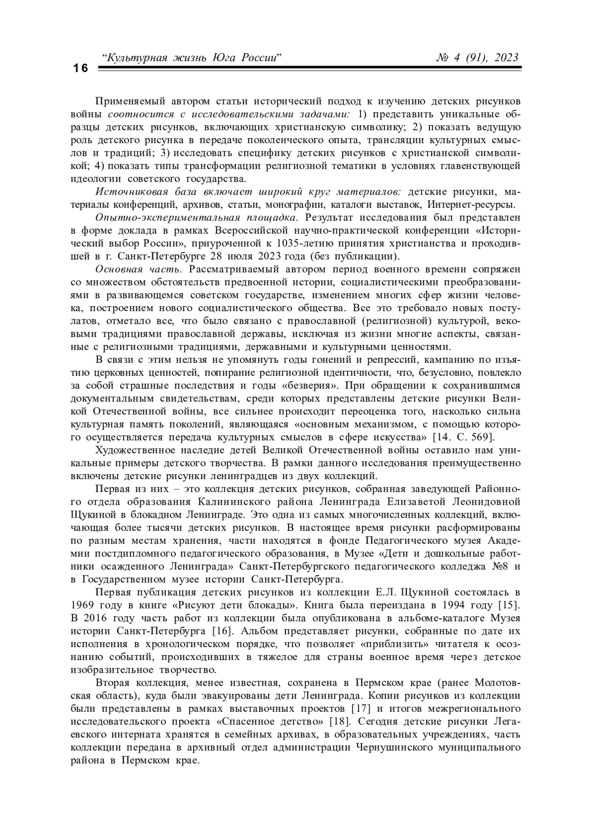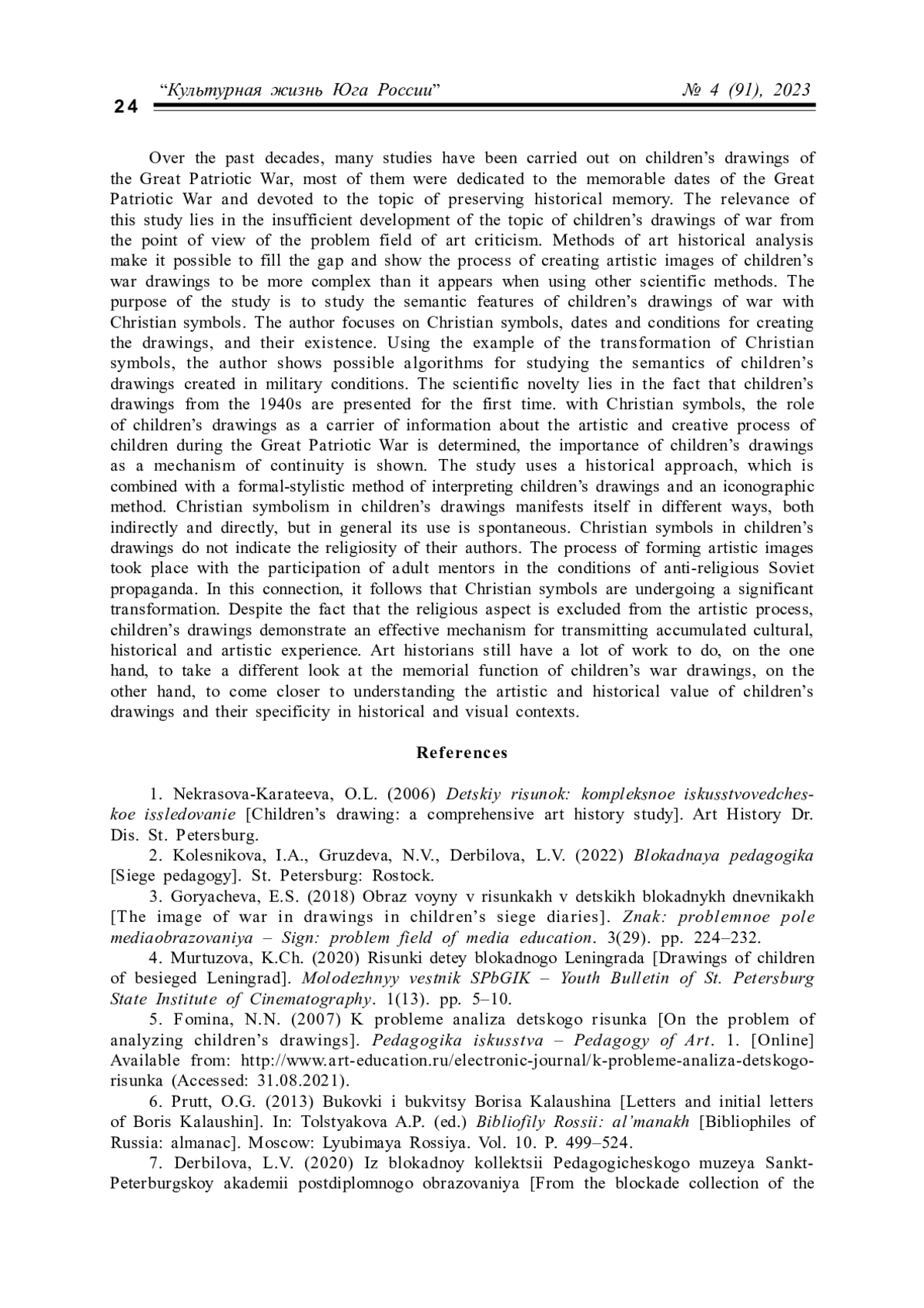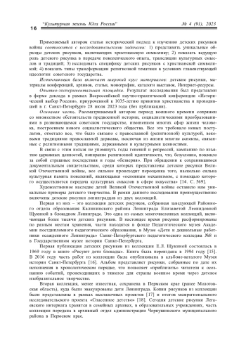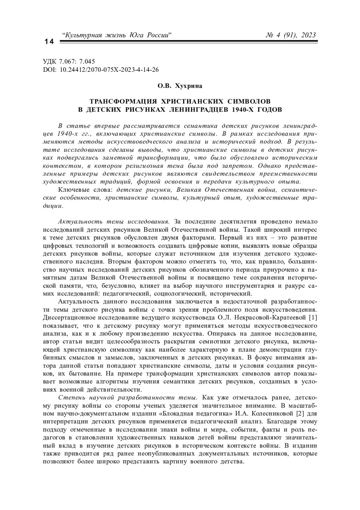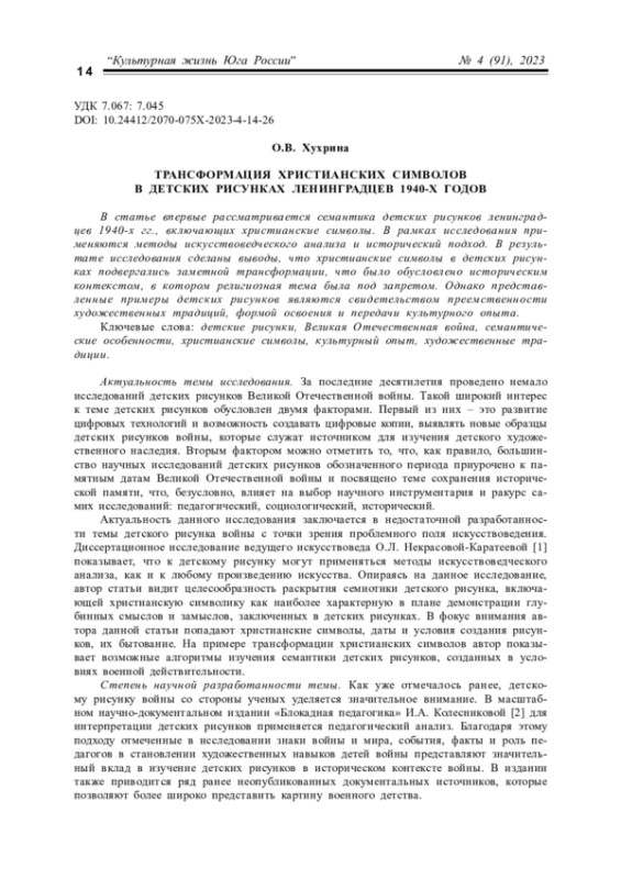 ХУХРИНА О. В. ТРАНСФОРМАЦИЯ ХРИСТИАНСКИХ СИМВОЛОВ В ДЕТСКИХ РИСУНКАХ ЛЕНИНГРАДЦЕВ 1940-Х ГОДОВ // КУЛЬТУРНАЯ ЖИЗНЬ ЮГА РОССИИ. 2023. № 4 (91)