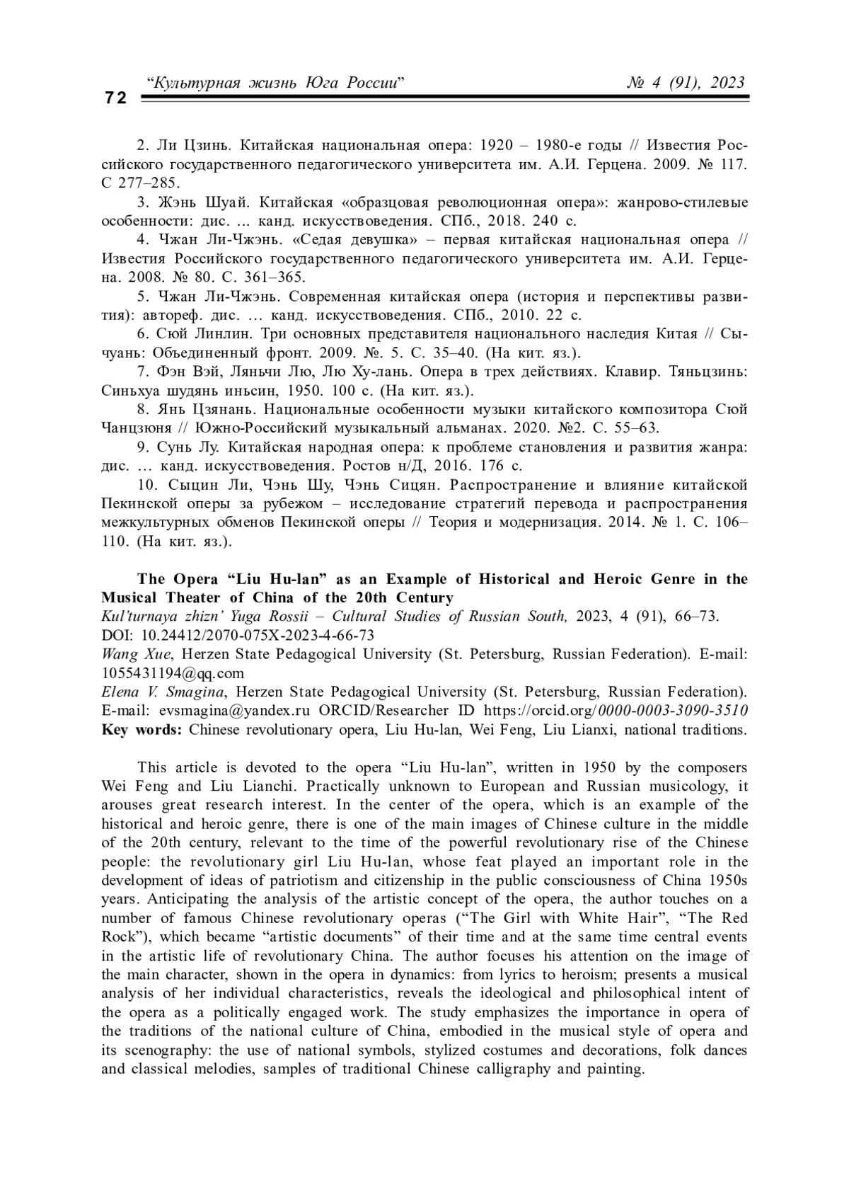 ВАН С., СМАГИНА Е. В. ОПЕРА "ЛЮ ХУ-ЛАНЬ" КАК ОБРАЗЕЦ ИСТОРИКО-ГЕРОИЧЕСКОГО ЖАНРА В МУЗЫКАЛЬНОМ ТЕАТРЕ КИТАЯ XX ВЕКА // КУЛЬТУРНАЯ ЖИЗНЬ ЮГА РОССИИ. 2023. № 4 (91)