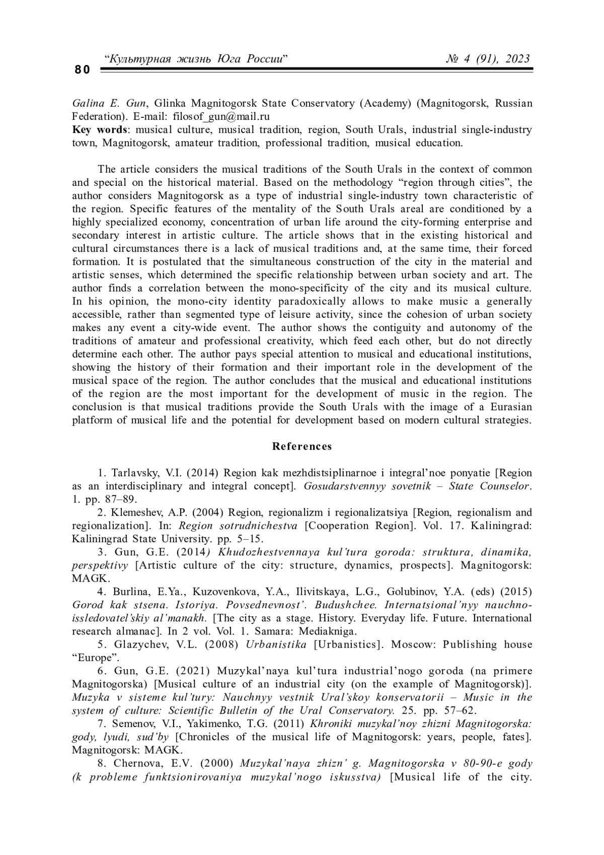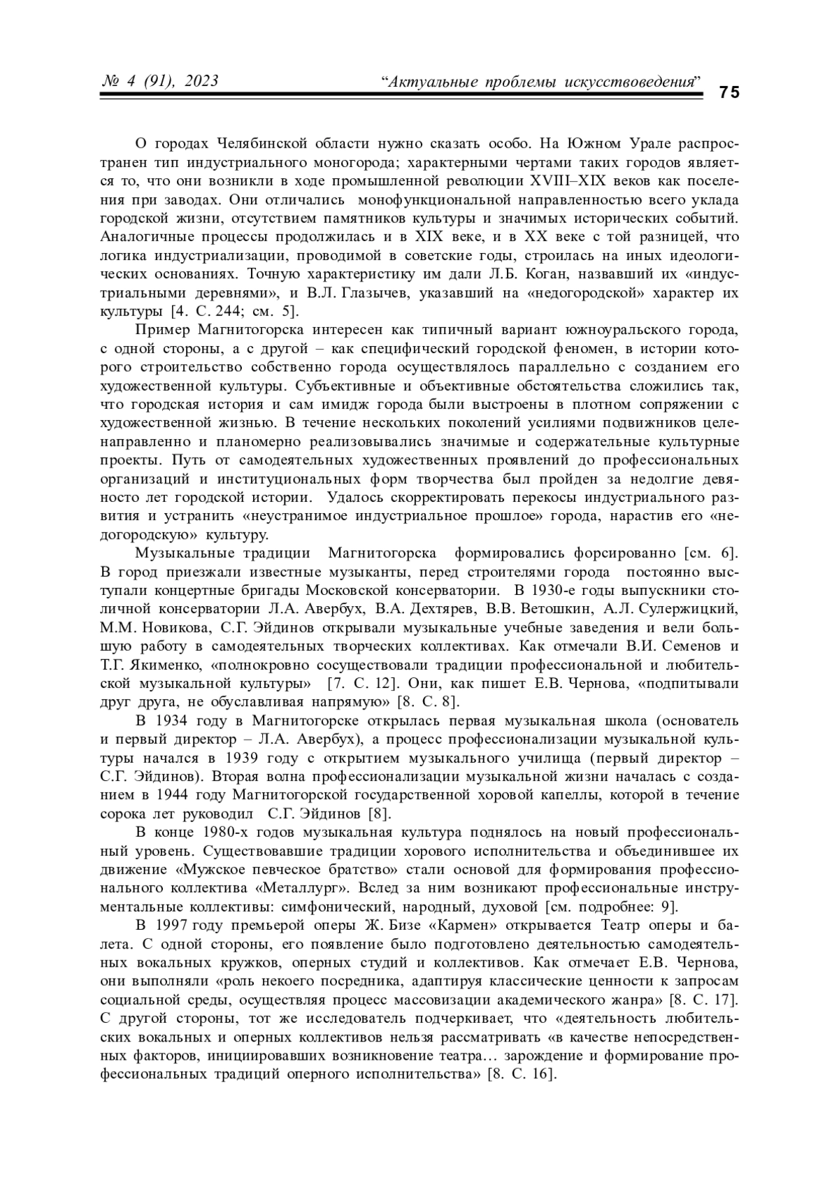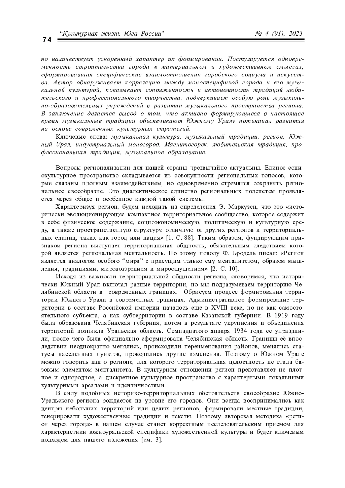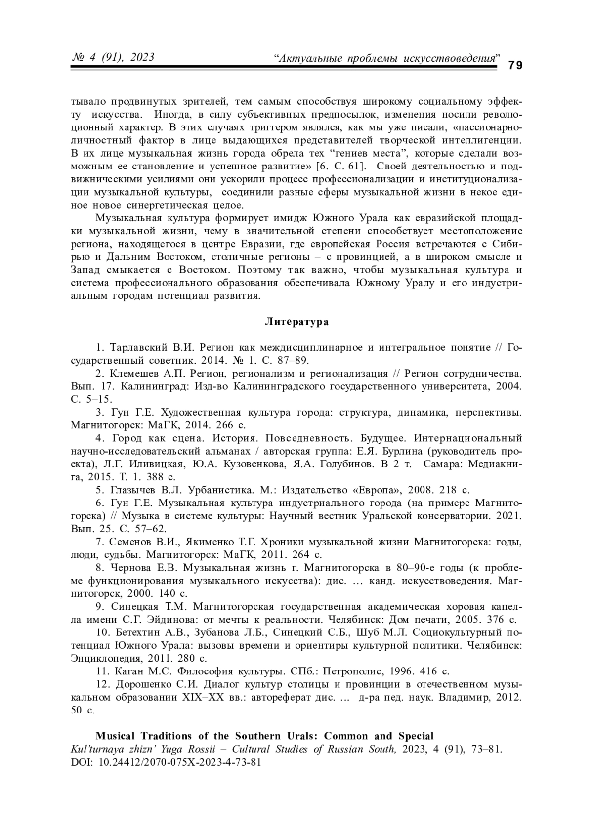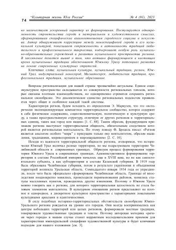 В статье на историческом материале рассматриваются музыкальные традиции Южного Урала в разрезе общего и особенного. Исходя из методики «регион через города», автор рассматривает Магнитогорск как характерный для региона тип индустриального моногорода. В статье показано, что для южноуральского ареала характерно отсутствие исторически сложившихся музыкальных традиций, “Актуальные проблемы искусствоведения” но наличествует ускоренный характер их формирования. Постулируется одновременность строительства города в материальном и художественном смыслах, сформировавшая специфические взаимоотношения городского социума и искусства. Автор обнаруживает корреляцию между моноспецификой города и его музыкальной культурой, показывает сопряженность и автономность традиций любительского и профессионального творчества, подчеркивает особую роль музыкально-образовательных учреждений в развитии музыкального пространства региона. В заключение делается вывод о том, что активно формирующиеся в настоящее время музыкальные традиции обеспечивают Южному Уралу потенциал развития на основе современных культурных стратегий