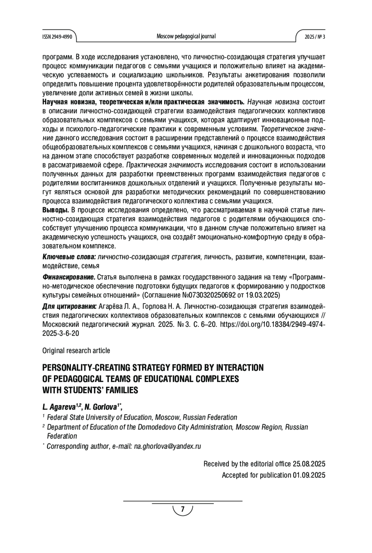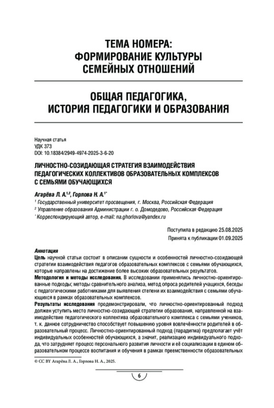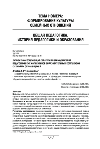 Цель научной статьи состоит в описании сущности и особенностей личностно-созидающей стратегии взаимодействия педагогов образовательных комплексов с семьями обучающихся, которые направлены на достижение более высоких образовательных результатов.
