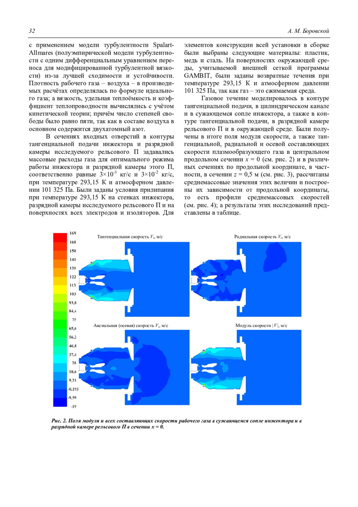 Были получены в ходе моделирования благодаря выполненным расчётам характеристики газового течения в области первоначального пробоя и возникновения электрической дуги, позволяющие оптимизировать конструкцию этого узла, в том числе и для возможного использования газовых смесей в качестве плазмообразующих. Полученные значения скорости газового потока в каналах инжектора [25–28] и данные ресурсных испытаний при этом позволяют оценить правильность принятых конструкторских решений и сделать вывод об эффективности газовихревой стабилизации процесса горения дуги в канале этого двухканального П со стержневыми электродами, то есть в инжекторе.