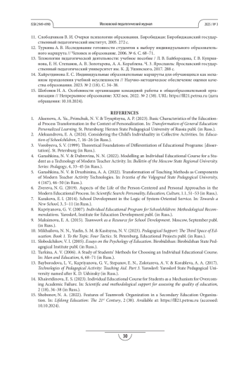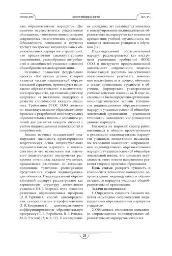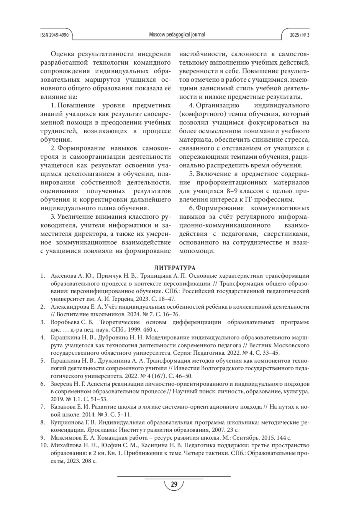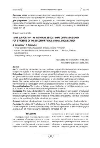 ГАРАШКИНА Н. В., ДУБРОВИНА Н. Н. ТЕХНОЛОГИЯ КОМАНДНОГО СОПРОВОЖДЕНИЯ ИНДИВИДУАЛЬНОГО ОБРАЗОВАТЕЛЬНОГО МАРШРУТА УЧАЩИХСЯ ОБЩЕОБРАЗОВАТЕЛЬНОЙ ОРГАНИЗАЦИИ // МОСКОВСКИЙ ПЕДАГОГИЧЕСКИЙ ЖУРНАЛ. 2025. № 3