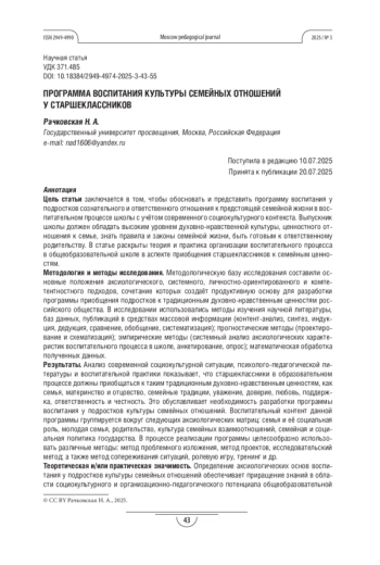 Результаты. Анализ современной социокультурной ситуации, психолого-педагогической литературы и воспитательной практики показывает, что старшеклассники в образовательном процессе должны приобщаться к таким традиционным духовно-нравственным ценностям, как семья, материнство и отцовство, семейные традиции, уважение, доверие, любовь, поддержка, ответственность и честность. Это обуславливает необходимость разработки программы воспитания у подростков культуры семейных отношений. Воспитательный контент данной программы группируется вокруг следующих аксиологических матриц: семья и её социальная роль, молодая семья, родительство, культура семейных взаимоотношений, семейная и социальная политика государства. В процессе реализации программы целесообразно использовать различные методы: метод проблемного изложения, метод проектов, исследовательский метод; а также метод сопереживания ситуаций, ролевую игру, тренинг и др.