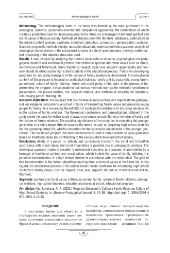 Методология и методы. В процессе работы применялись полипарадигмальный, системный и междисциплинарный методологические подходы. Использовались элементы контент-анализа научно-педагогических источников на русском и английском языках. При обосновании методологии исследования автор опирался на принципы педагогической аксиологии, метод философской герменевтики и сравнительно-педагогический метод, позволяющий сопоставить специфику подготовки педагогов-исследователей в России и за рубежом. В эмпирической части исследования был задействован метод анкетирования.