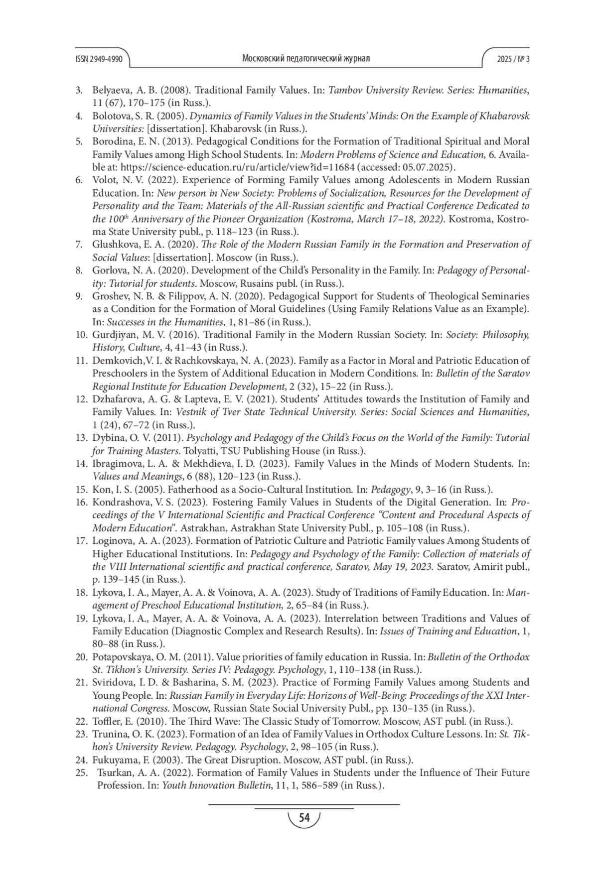 2. Айгумова З. И. Семейные ценности современной молодёжи (на примере исследования студентов педагогического университета) // Проблемы современного образования. 2022. № 4. С. 41-55. EDN: TBPXLV