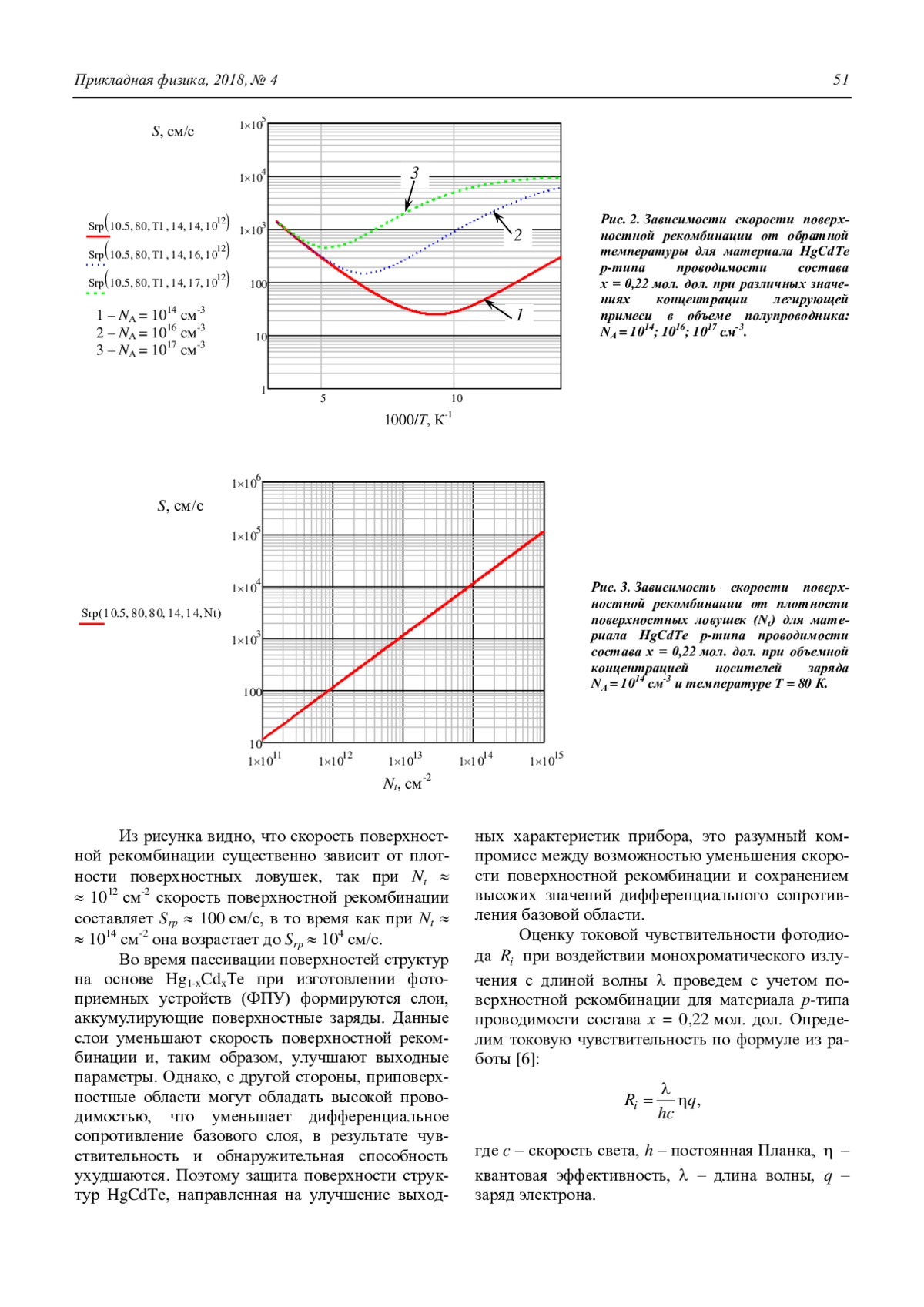 Проведены расчеты скорости поверхностной рекомбинации для слоев HgCdTe р-типа проводимости при различных концентрациях легирующих примесей и плотности концентрации ловушек Nt. Показано, что при указанных выше начальных параметрах скорость поверхностной рекомбинации Smax находится в диапазоне 10–104 см/с. Проведено моделирование токовой чувствительности для HgCdTe р-типа, используя зависимость квантовой эффективности в приближении больших времен жизни τn0 и больших диффузионных длин Ln неосновных носителей заряда с учетом влияния скорости поверхностной рекомбинации.