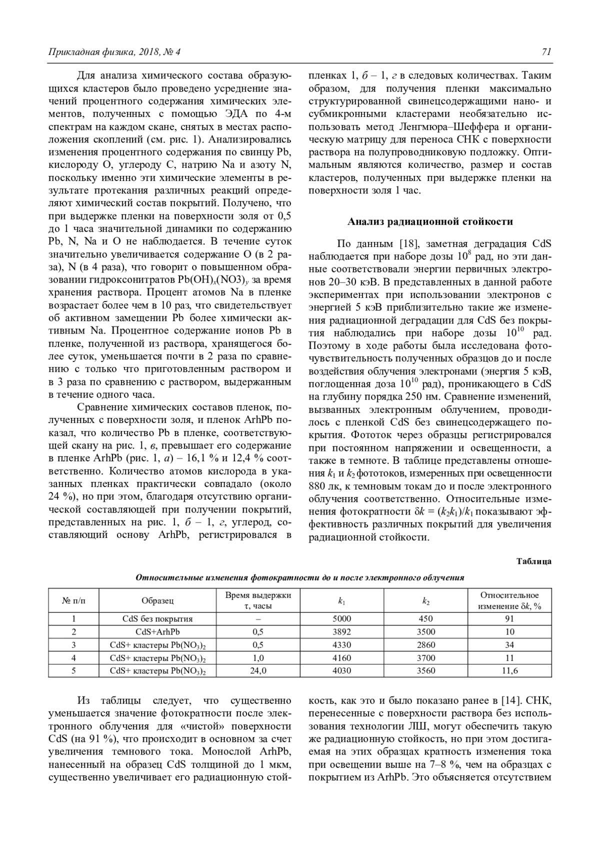 Таким образом, показано, что на щелочной субфазе возможно формирование приемлемого качества (состава и морфологии) наноразмерного свинецсодержащего покрытия без применения технологии Ленгмюра–Шеффера, пригодного для значительного увеличения устойчивости фотоэлектрических характеристик CdS к облучению электронами допороговых энергий.