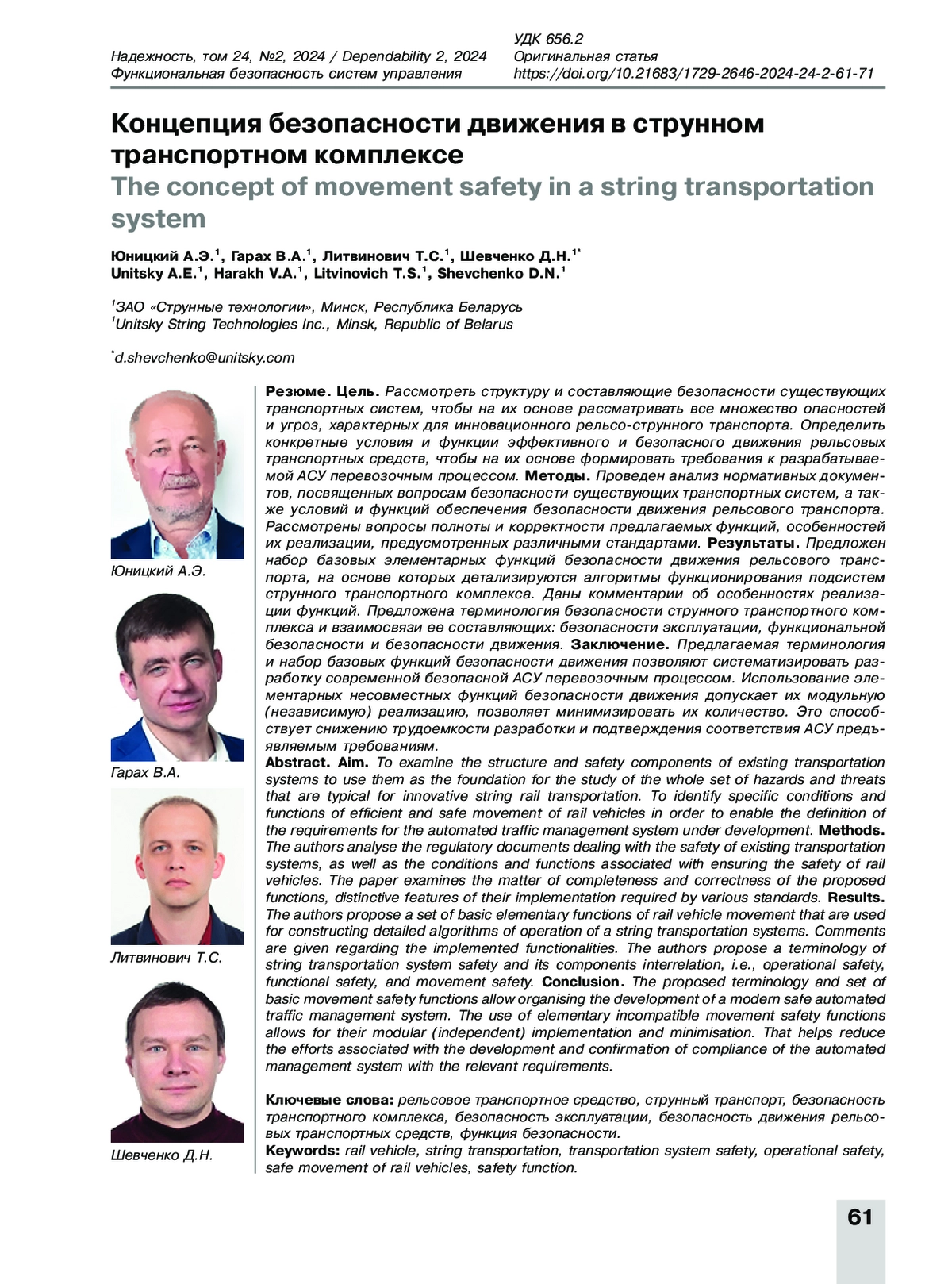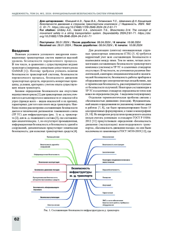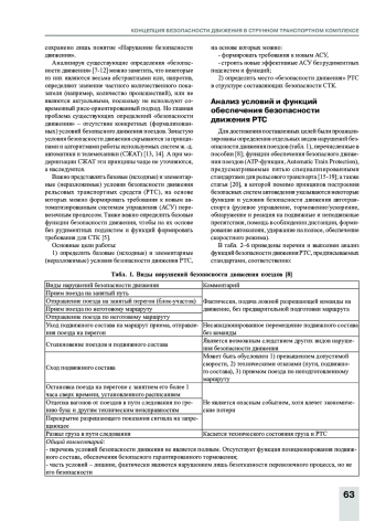 Цель. Рассмотреть структуру и составляющие безопасности существующих транспортных систем, чтобы на их основе рассматривать все множество опасностей и угроз, характерных для инновационного рельсо-струнного транспорта. Определить конкретные условия и функции эффективного и безопасного движения рельсовых транспортных средств, чтобы на их основе формировать требования к разрабатываемой АСУ перевозочным процессом. Методы. Проведен анализ нормативных документов, посвященных вопросам безопасности существующих транспортных систем, а также условий и функций обеспечения безопасности движения рельсового транспорта. Рассмотрены вопросы полноты и корректности предлагаемых функций, особенностей их реализации, предусмотренных различными стандартами. Результаты. Предложен набор базовых элементарных функций безопасности движения рельсового транспорта, на основе которых детализируются алгоритмы функционирования подсистем струнного транспортного комплекса. Даны комментарии об особенностях реализации функций. Предложена терминология безопасности струнного транспортного комплекса и взаимосвязи ее составляющих: безопасности эксплуатации, функциональной безопасности и безопасности движения. Заключение. Предлагаемая терминология и набор базовых функций безопасности движения позволяют систематизировать разработку современной безопасной АСУ перевозочным процессом. Использование элементарных несовместных функций безопасности движения допускает их модульную (независимую) реализацию, позволяет минимизировать их количество. Это способствует снижению трудоемкости разработки и подтверждения соответствия АСУ предъявляемым требованиям.