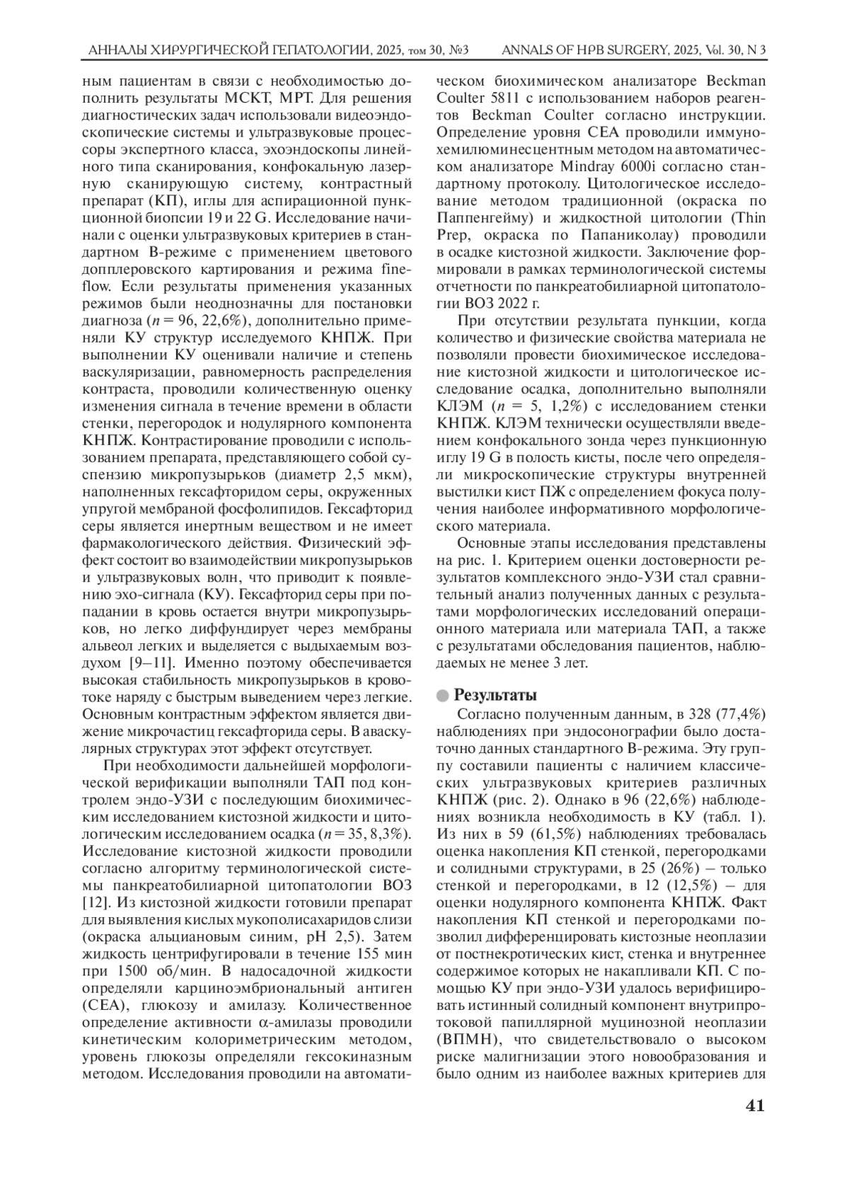 Материал и методы. С 2014 по 2025 г. выполнено 386 резекций поджелудочной железы, из них 82 (21,24%) по поводу кистозных опухолей. Средний возраст пациентов составил 51 ± 10,7 года, 63,4% больных – женщины.