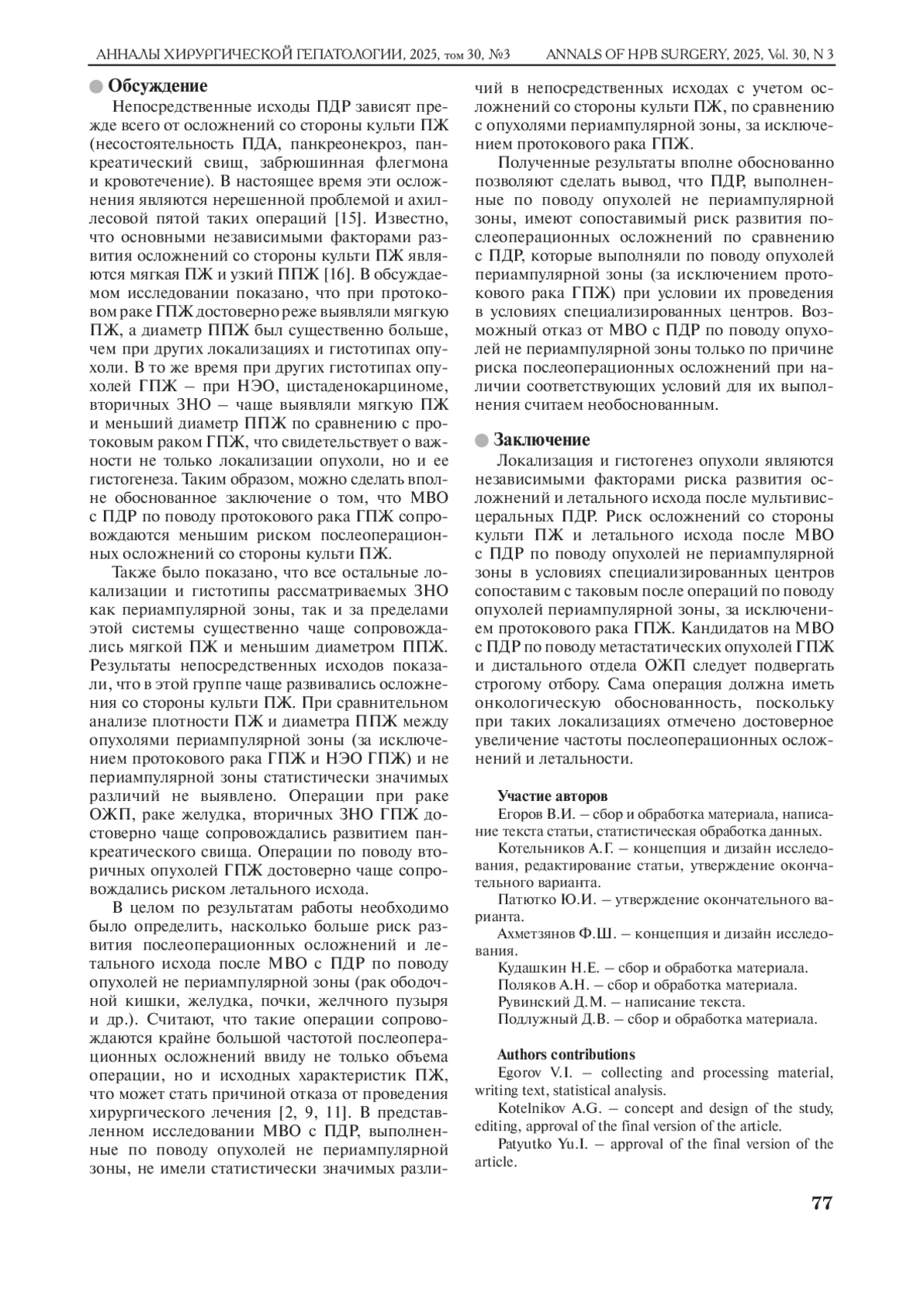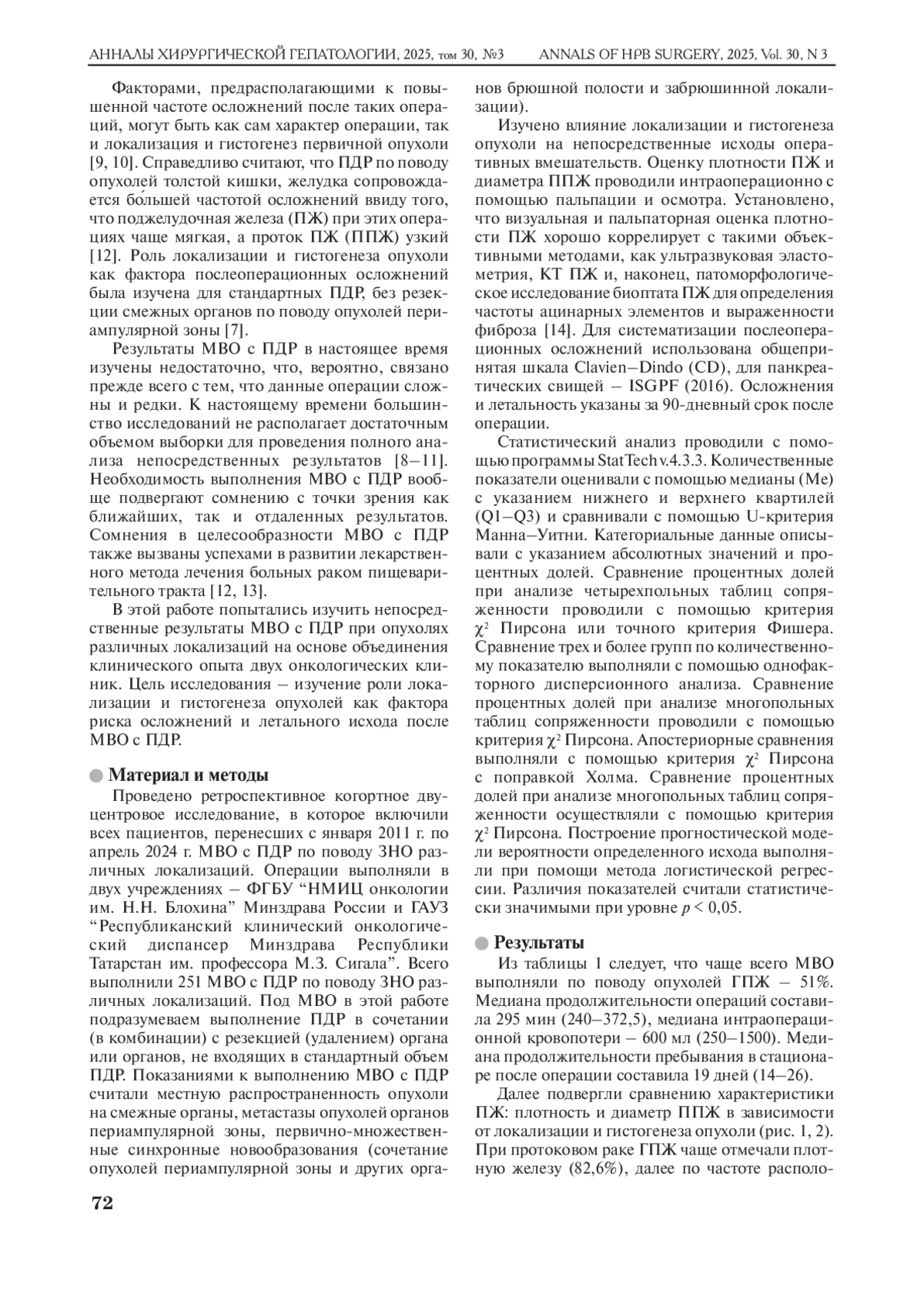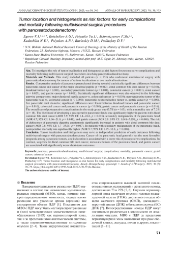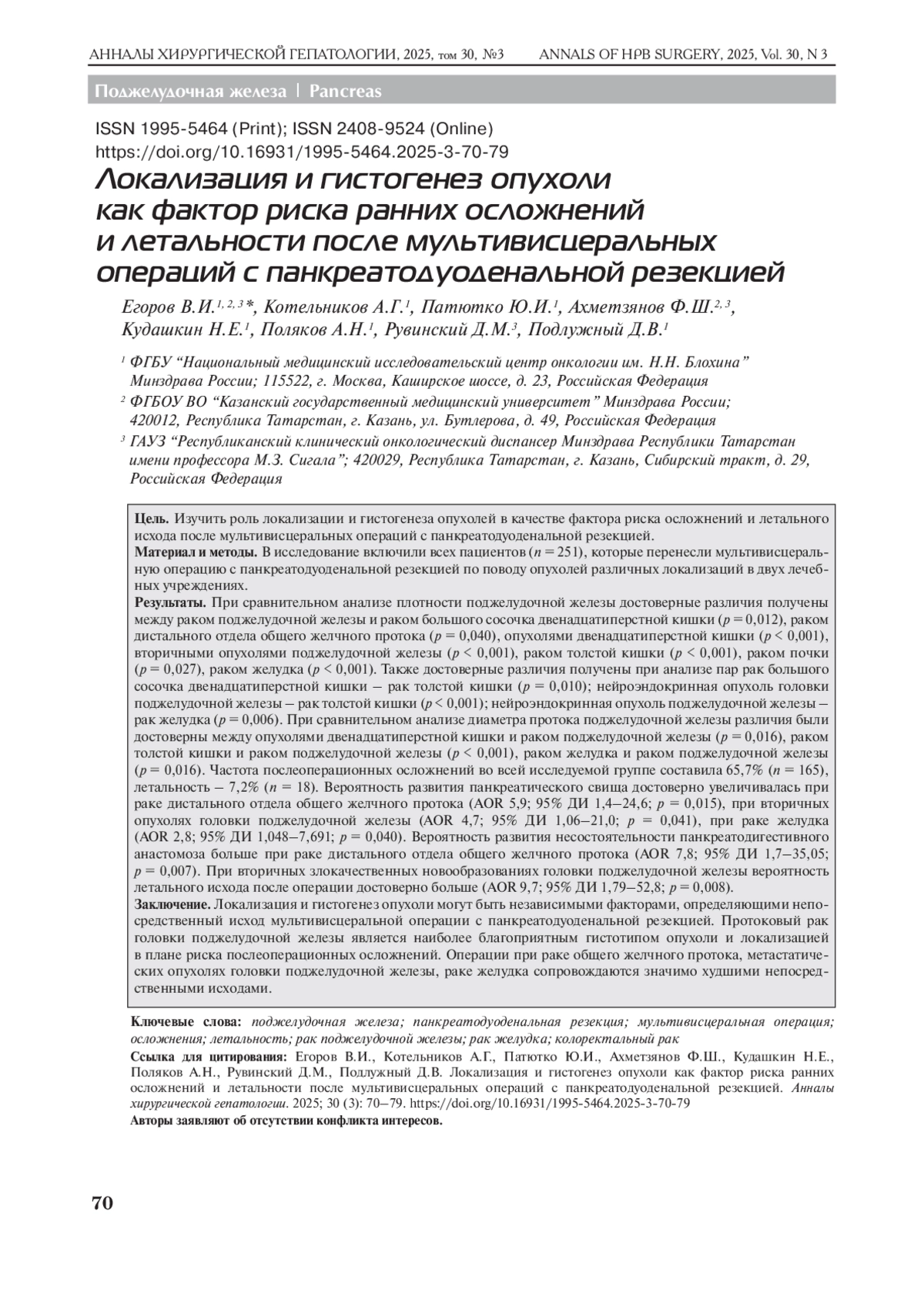 ЕГОРОВ В. И., КОТЕЛЬНИКОВ А. Г., ПАТЮТКО Ю. И., АХМЕТЗЯНОВ Ф. Ш., КУДАШКИН Н. Е., ПОЛЯКОВ А. Н., РУВИНСКИЙ Д. М., ПОДЛУЖНЫЙ Д. В. ЛОКАЛИЗАЦИЯ И ГИСТОГЕНЕЗ ОПУХОЛИ КАК ФАКТОР РИСКА РАННИХ ОСЛОЖНЕНИЙ И ЛЕТАЛЬНОСТИ ПОСЛЕ МУЛЬТИВИСЦЕРАЛЬНЫХ ОПЕРАЦИЙ С ПАНКРЕАТОДУОДЕНАЛЬНОЙ РЕЗЕКЦИЕЙ // АННАЛЫ ХИРУРГИЧЕСКОЙ ГЕПАТОЛОГИИ. 2025. № 3, ТОМ 30