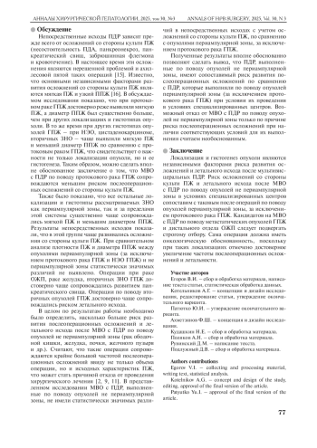 Заключение. Локализация и гистогенез опухоли могут быть независимыми факторами, определяющими непосредственный исход мультивисцеральной операции с панкреатодуоденальной резекцией. Протоковый рак головки поджелудочной железы является наиболее благоприятным гистотипом опухоли и локализацией в плане риска послеоперационных осложнений. Операции при раке общего желчного протока, метастатических опухолях головки поджелудочной железы, раке желудка сопровождаются значимо худшими непосредственными исходами.