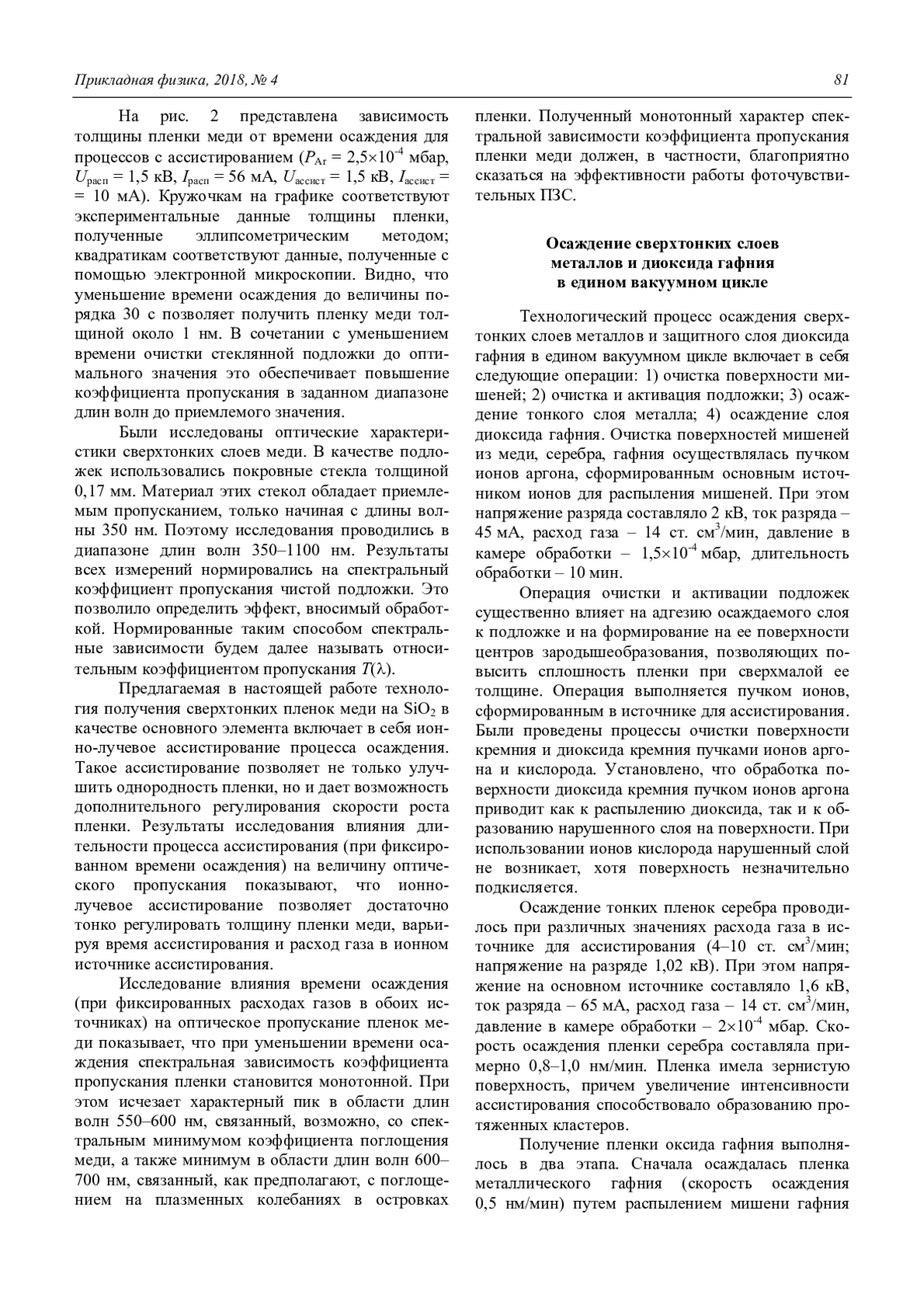 Полученные результаты показывают перспективность предложенного метода осаждения сверхтонких пленок меди и серебра на SiO2, сочетающего ионно-лучевую очистку поверхности пучками ионов аргона и кислорода, осаждение путем ионно-лучевого распыления и ионно-лучевое ассистирование процесса осаждения в едином вакуумном цикле. Ионно-лучевое ассистирование позволяет тонко регулировать толщину осаждаемых пленок меди и серебра, варьируя время ассистирования и расход газа в источнике ионов ассистирования.