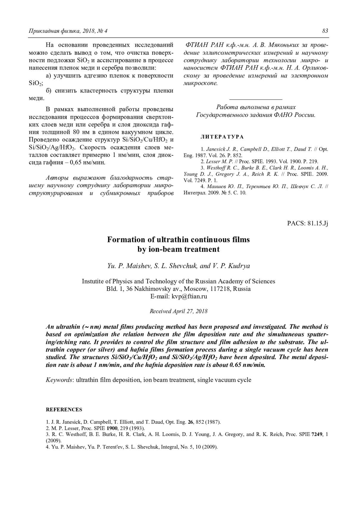Маишев Ю. П., Шевчук С. Л., Кудря В. П. Формирование сверхтонких сплошных пленок методом ионно-лучевой обработки 79