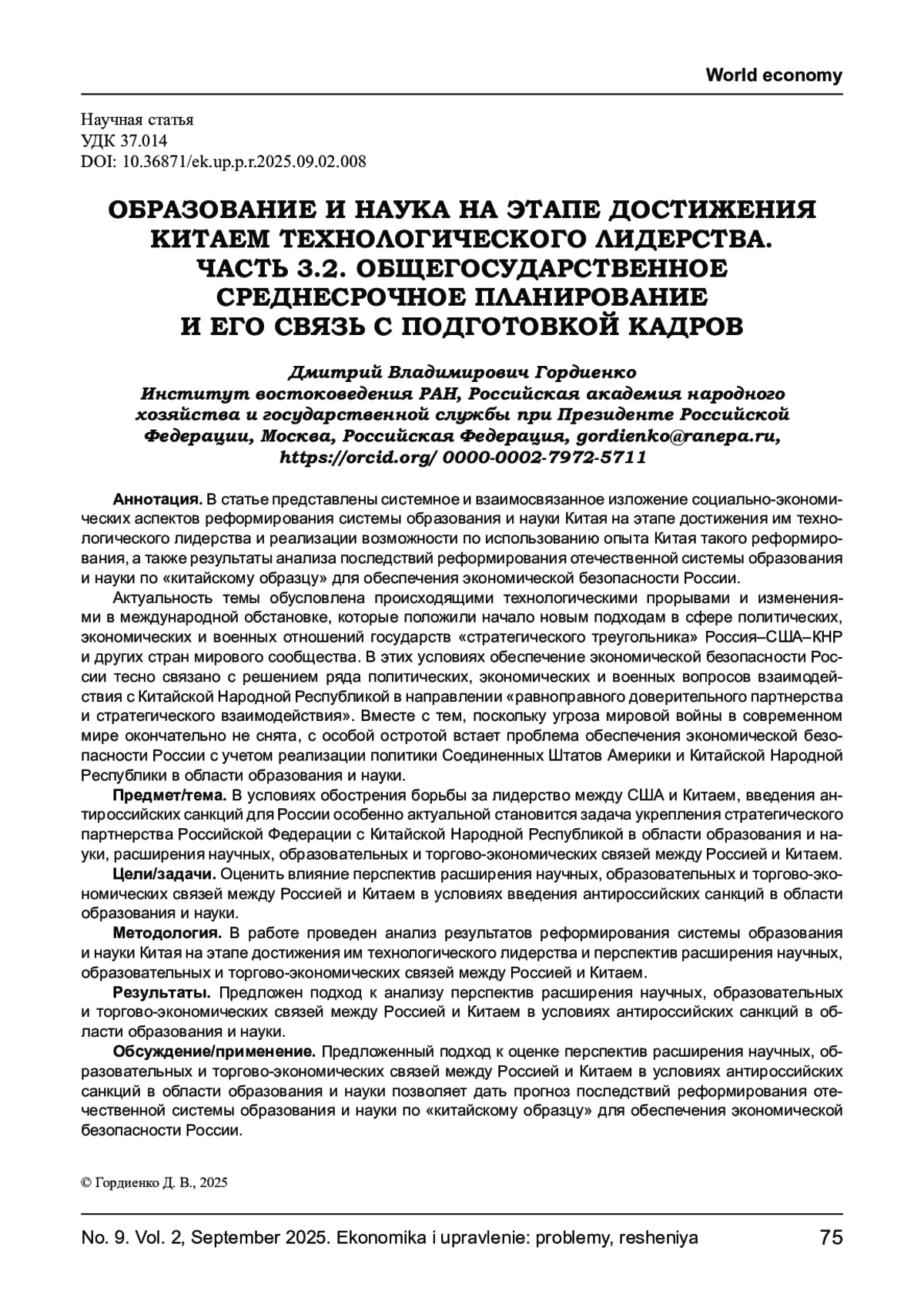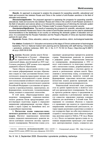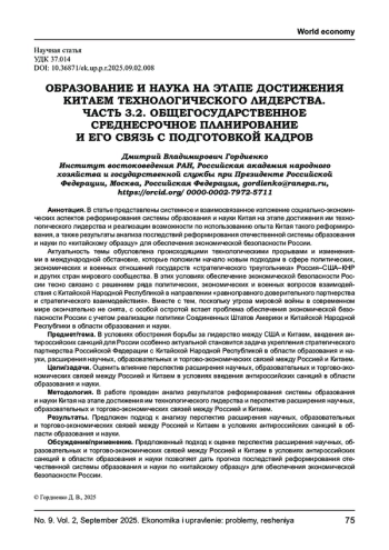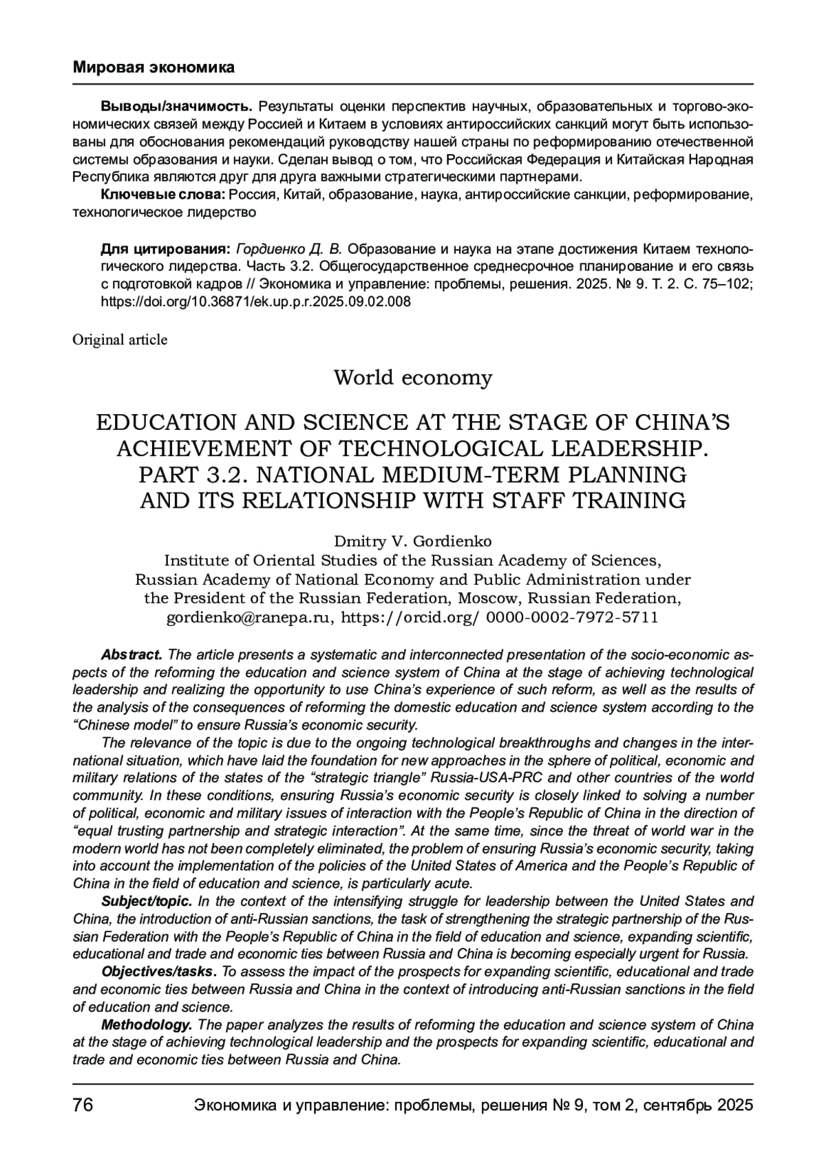 ГОРДИЕНКО Д. В. ОБРАЗОВАНИЕ И НАУКА НА ЭТАПЕ ДОСТИЖЕНИЯ КИТАЕМ ТЕХНОЛОГИЧЕСКОГО ЛИДЕРСТВА. ЧАСТЬ 3.2. ОБЩЕГОСУДАРСТВЕННОЕ СРЕДНЕСРОЧНОЕ ПЛАНИРОВАНИЕ И ЕГО СВЯЗЬ С ПОДГОТОВКОЙ КАДРОВ // ЭКОНОМИКА И УПРАВЛЕНИЕ: ПРОБЛЕМЫ, РЕШЕНИЯ. 2025. ТОМ 2 № 9