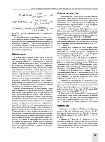Выводы. Предложен алгоритм учета отказов изделий по входящим документам. Разработаны программные решения для автоматизации процесса сбора и обработки данных о неисправностях компонентов пассажирских вагонов. Рассмотрена методика учета гарантийного парка, необходимого для формирования суммарной наработки в процессе расчета показателей надежности компонентов пассажирских вагонов в процессе эксплуатации. Предложен кодификатор отказов, учитывающий особенности структурной взаимосвязи компонентов пассажирских вагонов.