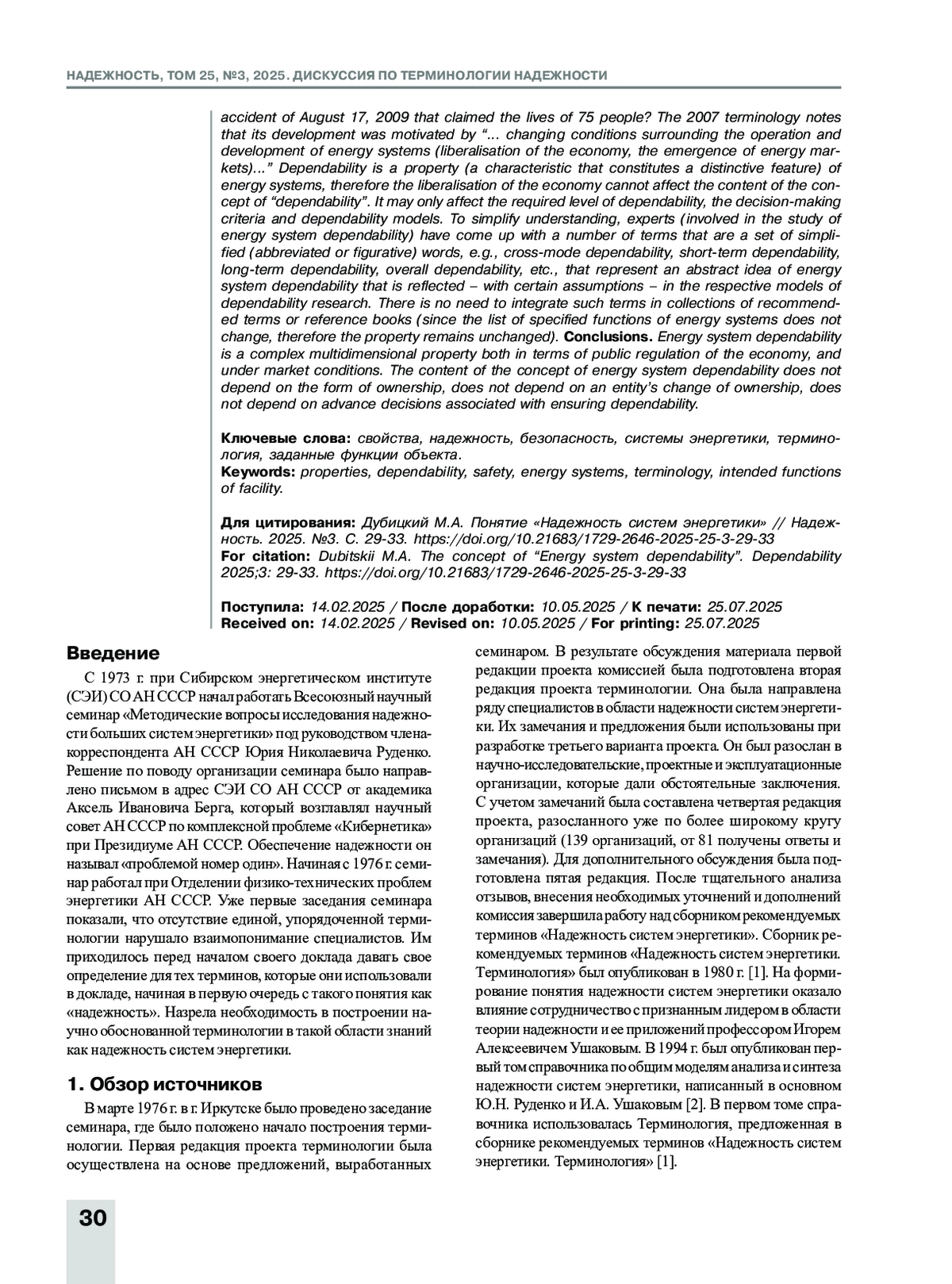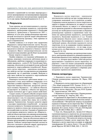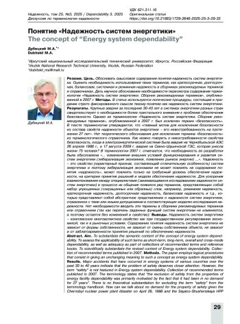 Цель. Обосновать смысловое содержание понятия надежность систем энергетики. Оценить необходимость использования таких терминов, как краткосрочная, долгосрочная, балансовая, системная и режимная надежность в сборниках рекомендуемых терминов и справочниках. Дать научное обоснование необходимости пересмотра содержания терминологии «Надежность систем энергетики. Сборник рекомендуемых терминов», опубликованной в 2007 г. Методы. В статье используются логические процедуры, состоящие в придании строго фиксированного смысла такому понятию как надежность систем энергетики. Результаты. Крупные аварии за последние 30-40 лет в системах энергетики разных стран свидетельствуют о необходимости более пристального внимания к проблеме обеспечения безопасности. Однако из терминологии «Надежность систем энергетики. Сборник рекомендуемых терминов», опубликованной в 2007 г. был исключен термин «безопасность». В тексте терминологии утверждается, что «главный мотив для исключения безопасности из состава свойств надежности объектов энергетики – его невостребованность на протяжении 27 лет». Нет теоретического обоснования для исключения термина «безопасность» из терминологического справочника. Как можно говорить о невостребованности свойства безопасность, когда в электроэнергетической системе была авария на Чернобыльской АЭС 26 апреля 1986 г., а 17 августа 2009 г. авария на Саяно-Шушенской ГЭС, которая унесла жизни 75 человек? В терминологии 2007 г. отмечается, что необходимость ее разработки была обусловлена «… изменениями внешних условий функционирования и развития систем энергетики (либерализация экономики, появление рынков энергии) …». Надежность – это свойство (характерный признак, составляющий отличительную особенность) систем энергетики и поэтому либерализация экономики не может повлиять на содержание понятия «надежность», может повлиять только на требуемый уровень обеспечения надежности, на критерии принятия решений и модели обеспечения надежности. Для ускорения взаимопонимания между специалистами (занимающимися исследованием надежности систем энергетики) в процессе их общения появился ряд терминов, представляющих собой набор упрощенных (сокращенных или образных) слов, например, режимная надежность, краткосрочная надежность, долгосрочная надежность, балансовая надежность и т. д., которые представляют собой абстрактное представление о надежности систем энергетики, отраженное с теми или иными допущениями в соответствующих моделях исследования надежности. Нет необходимости вводить эти термины в сборники рекомендуемых терминов или справочники (так как перечень заданных функций систем энергетики не изменяется, а поэтому остается без изменений и свойство). Выводы. Надежность систем энергетики – комплексное многоаспектное свойство как при государственном регулировании экономикой, так и в рыночных условиях. Содержание понятия надежность систем энергетики не зависит от формы собственности, не зависит от смены собственника объекта, не зависит и от заблаговременности принятия решений по обеспечению надежности.