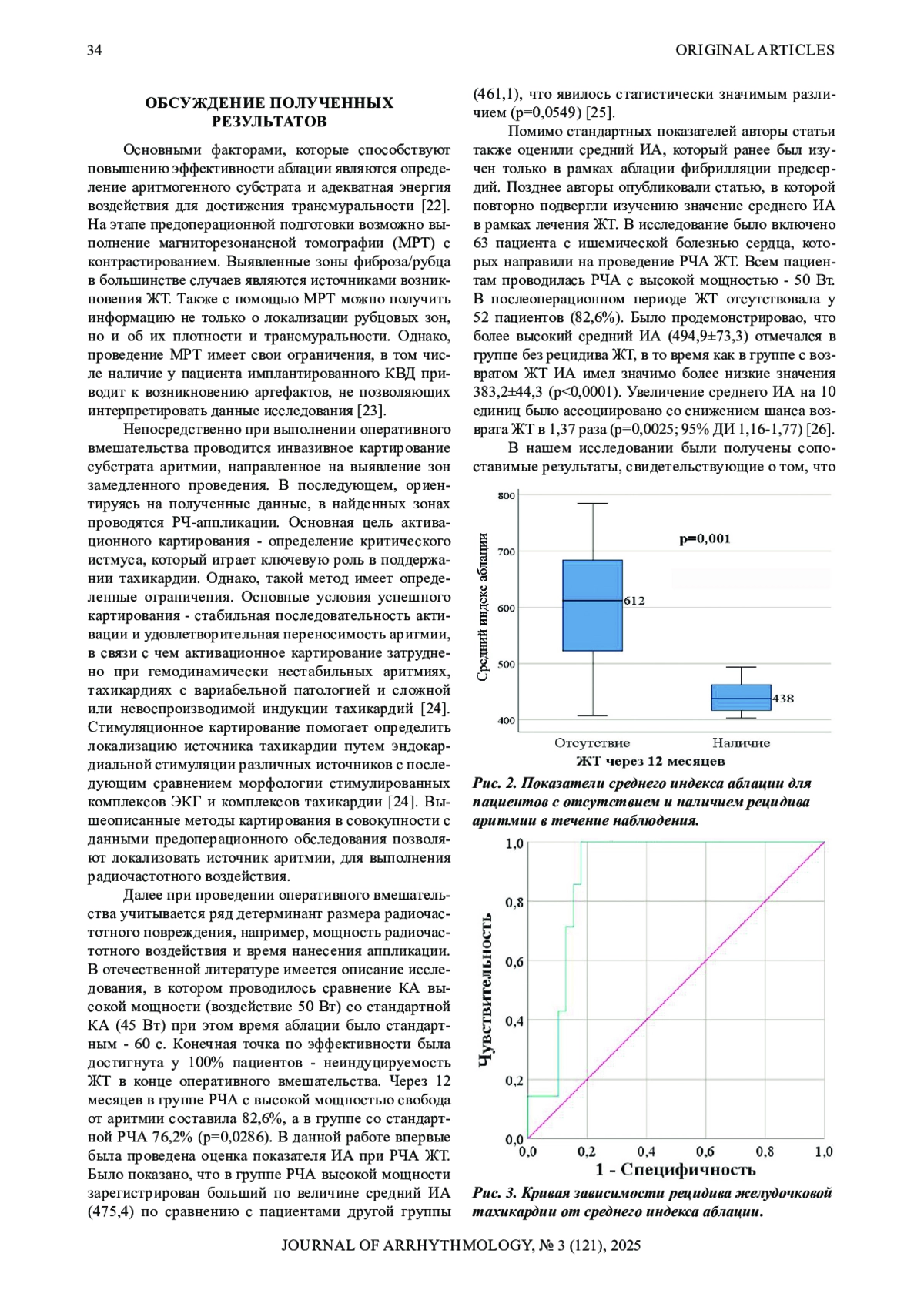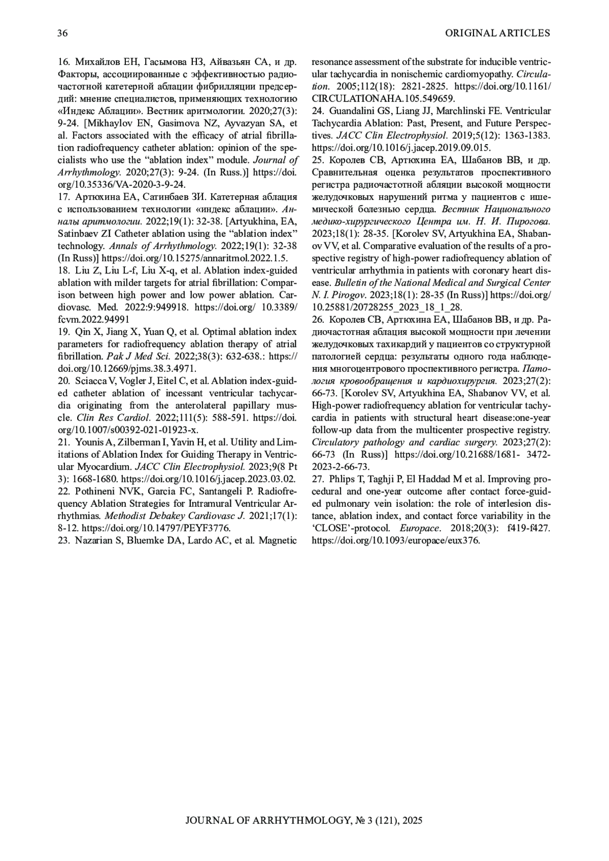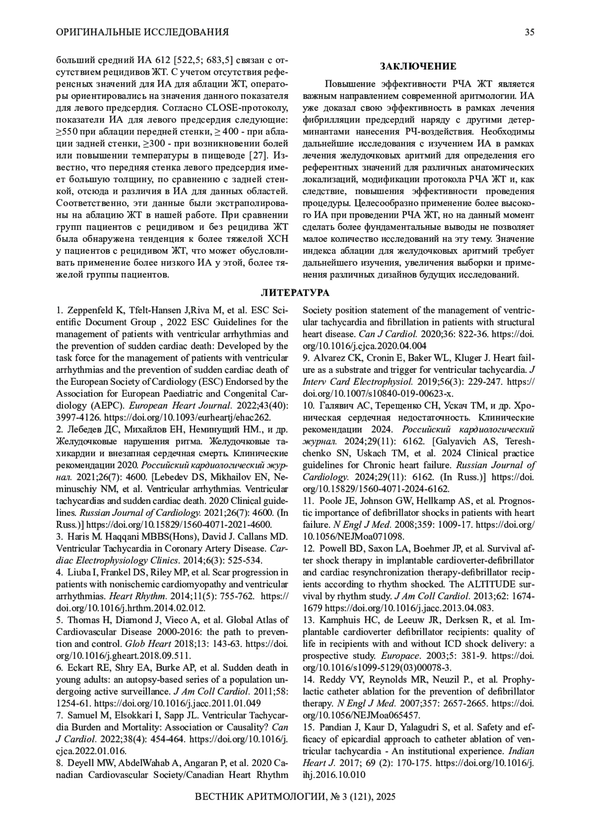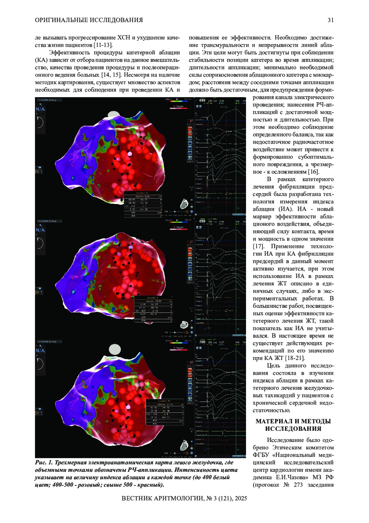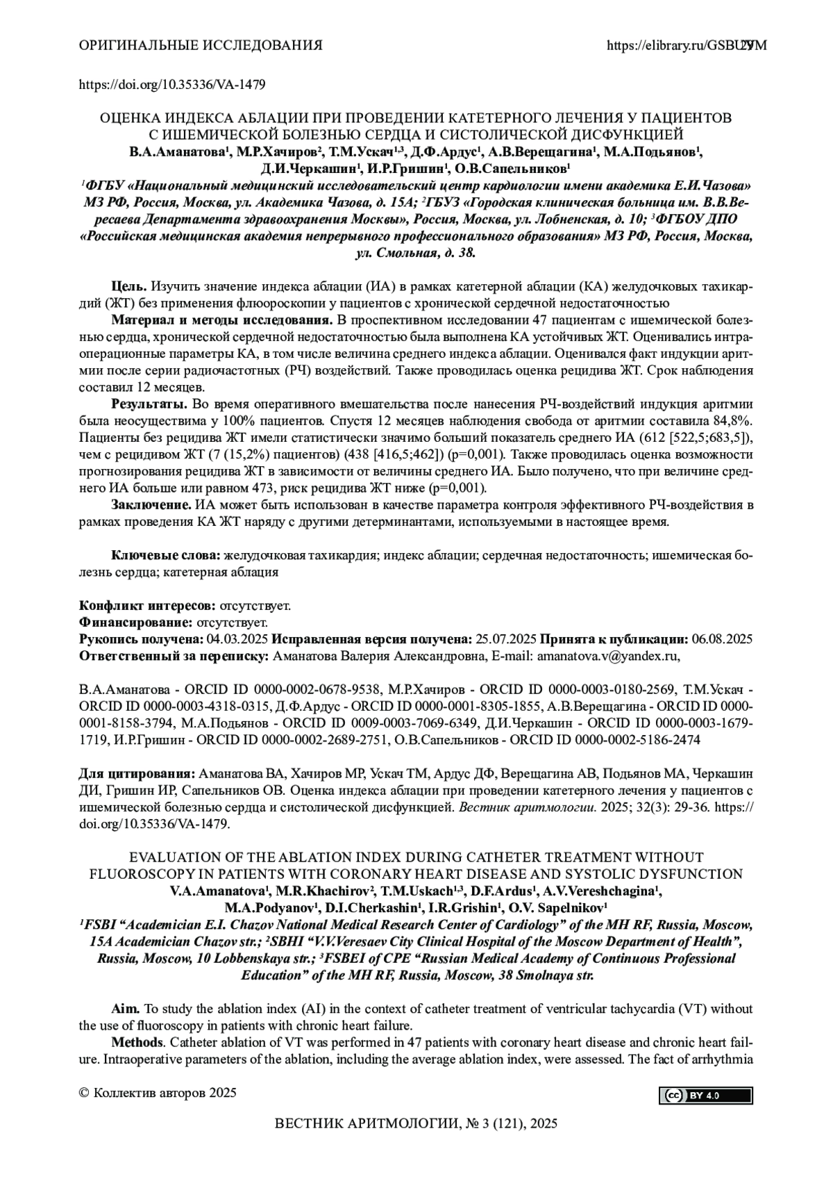 АМАНАТОВА В. А., ХАЧИРОВ М.Р., УСКАЧ Т. М., АРДУС Д.Ф., ВЕРЕЩАГИНА А. В., ПОДЬЯНОВ М.А., ЧЕРКАШИН Д.И., ГРИШИН И.Р., САПЕЛЬНИКОВ О.В. ОЦЕНКА ИНДЕКСА АБЛАЦИИ ПРИ ПРОВЕДЕНИИ КАТЕТЕРНОГО ЛЕЧЕНИЯ У ПАЦИЕНТОВ С ИШЕМИЧЕСКОЙ БОЛЕЗНЬЮ СЕРДЦА И СИСТОЛИЧЕСКОЙ ДИСФУНКЦИЕЙ // ВЕСТНИК АРИТМОЛОГИИ. 2025. № 3 (121), ТОМ 32