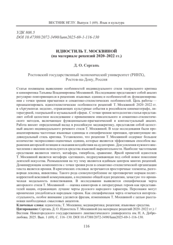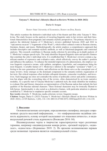 Статья посвящена выявлению особенностей индивидуального стиля театрального критика и кинокритика Татьяны Владимировны Москвиной. Исследование представляет собой анализ регулярно повторяющихся в рецензиях языковых единиц и особенностей их функционирования с точки зрения прагматики и семантико-стилистических особенностей. Цель работы - проанализировать идиостилистические особенности рецензий Т. Москвиной 2020-2022 гг. в «Аргументах недели», отражающих культурные события в российском кинематографе, литературной, театральной и музыкальной сферах. С точки зрения методологии статья представляет собой целостное исследование с применением описательного и семантико-стилистического методов, включающее функционально-прагматический и контекстуальный анализ. Работа вносит определенный вклад в российскую медиакритику, представляя собой целостный анализ индивидуального речевого стиля Т. Москвиной. В ходе исследования были проанализированы частотные языковые единицы и специфические признаки, организующие индивидуальный стиль критика. Установлено, что рецензии Т. Москвиной содержат большое количество экспрессивно-оценочных единиц, которые являются эффективным способом выражения авторской позиции и оказания воздействия на аудиторию. Для усиления нужного впечатления о явлении используются средства языковой выразительности. Наиболее частотными средствами являются эпитет, метафора, гипербола, сравнение. Яркой приметой идиостиля Т. Москвиной является метафора «детишки», подразумевающая под собой новое поколение деятелей искусства. Размышления на эту тему являются идейным центром многих рецензий. Доминирующим компонентом с точки зрения роли в семантико-стилистической организации текста является ирония. В критических откликах встречаются просторечные элементы, разговорная лексика, инвективы. Такого рода словоупотребление не противоречит нормам политкорректной вежливой коммуникации, а подчинено общей идее рецензии, зачастую это ироническая модальность повествования. В исследовании выявляется специфическая черта авторского стиля Т. Москвиной - оценка киногероев и литературных героев как представителей нации, отражающих лучшие черты русского народного характера. Персонажи могут иронически уподобляться народным героям. Как специфическая черта отмечается интертекстуальность, особое внимание уделяется фразам, измененным Т. Москвиной с целью расстановки необходимых смысловых акцентов.