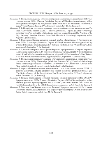 10. Куликова Э. Г., Кодалаева Х. Г., Акай О. М. Лексическая периферия как ресурс изобразительности и выразительности медиатекста // Вестник Нижегородского государственного лингвистического университета им. Н. А. Добролюбова. 2023. Вып. 4 (64). С. 117-132. [Kulikova, Ella G., Kodalaeva, Khansiat G., & Akay, Oksana M. (2023) Leksicheskaja periferija kak resurs izobrazitel’nosti i vyrazitel’nosti mediateksta (Lexical Periphery as a Resource for Figurativeness and Expressiveness of Media Texts). LUNN Bulletin, 4 (64), 117-132. (In Russian)]. EDN: BPRSPJ
