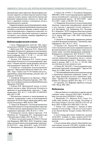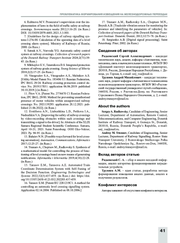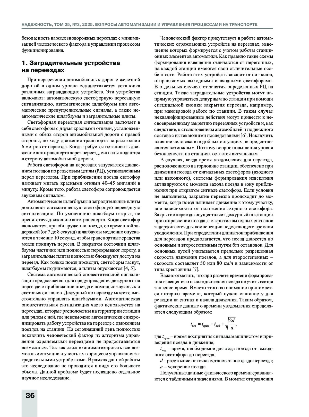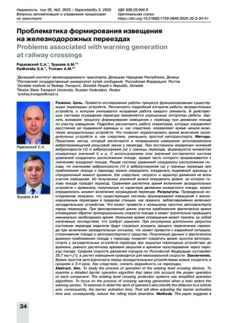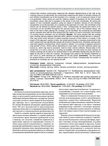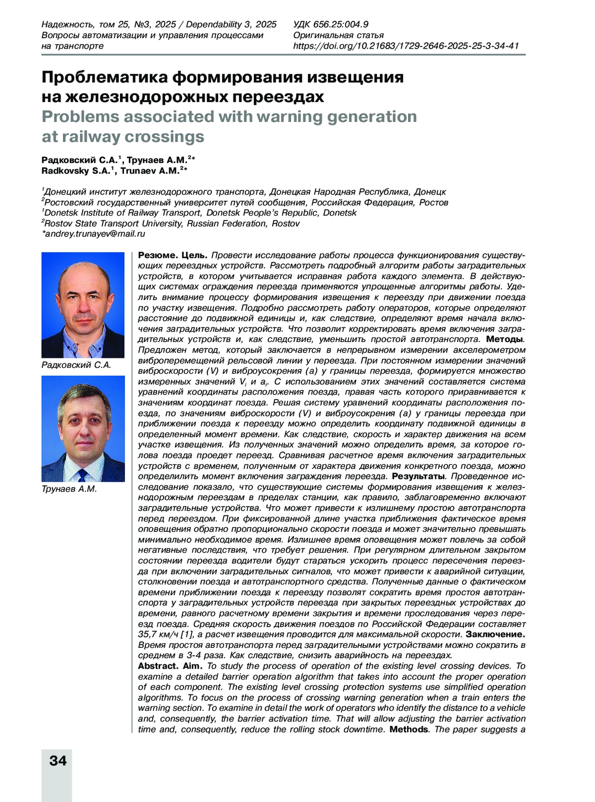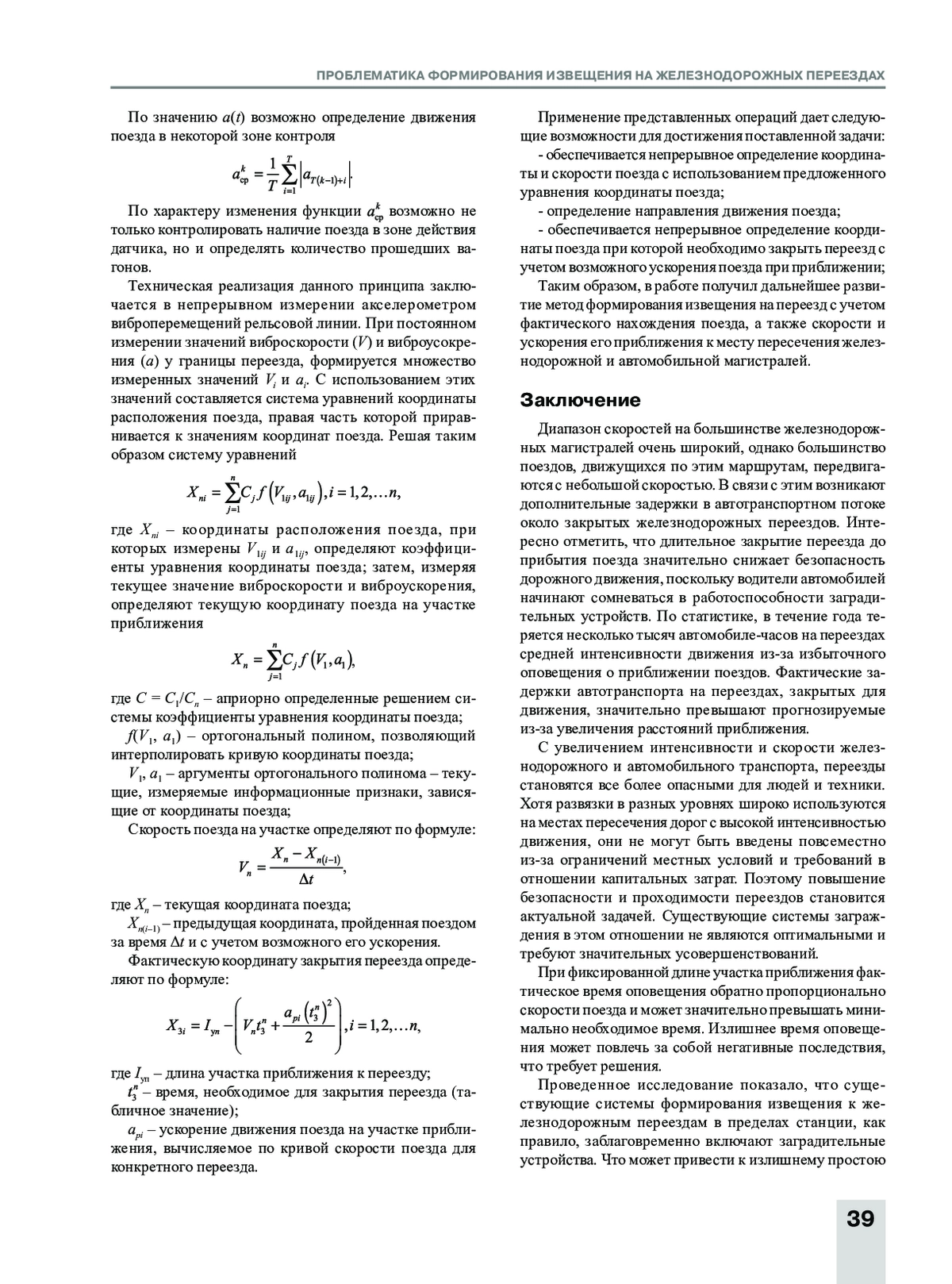 Цель. Провести исследование работы процесса функционирования существующих переездных устройств. Рассмотреть подробный алгоритм работы заградительных устройств, в котором учитывается исправная работа каждого элемента. В действующих системах ограждения переезда применяются упрощенные алгоритмы работы. Уделить внимание процессу формирования извещения к переезду при движении поезда по участку извещения. Подробно рассмотреть работу операторов, которые определяют расстояние до подвижной единицы и, как следствие, определяют время начала включения заградительных устройств. Что позволит корректировать время включения заградительных устройств и, как следствие, уменьшить простой автотранспорта. Методы. Предложен метод, который заключается в непрерывном измерении акселерометром виброперемещений рельсовой линии у переезда. При постоянном измерении значений виброскорости (V) и виброусокрения (a) у границы переезда, формируется множество измеренных значений Vi и ai. С использованием этих значений составляется система уравнений координаты расположения поезда, правая часть которого приравнивается к значениям координат поезда. Решая систему уравнений координаты расположения поезда, по значениям виброскорости (V) и виброусокрения (a) у границы переезда при приближении поезда к переезду можно определить координату подвижной единицы в определенный момент времени. Как следствие, скорость и характер движения на всем участке извещения. Из полученных значений можно определить время, за которое голова поезда проедет переезд. Сравнивая расчетное время включения заградительных устройств с временем, полученным от характера движения конкретного поезда, можно определилить момент включения заграждения переезда. Результаты. Проведенное исследование показало, что существующие системы формирования извещения к железнодорожным переездам в пределах станции, как правило, заблаговременно включают заградительные устройства. Что может привести к излишнему простою автотранспорта перед переездом. При фиксированной длине участка приближения фактическое время оповещения обратно пропорционально скорости поезда и может значительно превышать минимально необходимое время. Излишнее время оповещения может повлечь за собой негативные последствия, что требует решения. При регулярном длительном закрытом состоянии переезда водители будут стараться ускорить процесс пересечения переезда при включении заградительных сигналов, что может привести к аварийной ситуации, столкновении поезда и автотранспортного средства. Полученные данные о фактическом времени приближении поезда к переезду позволят сократить время простоя автотранспорта у заградительных устройств переезда при закрытых переездных устройствах до времени, равного расчетному времени закрытия и времени проследования через переезд поезда. Средняя скорость движения поездов по Российской Федерации составляет 35,7 км/ч [1], а расчет извещения проводится для максимальной скорости. Заключение. Время простоя автотранспорта перед заградительными устройствами можно сократить в среднем в 3-4 раза. Как следствие, снизить аварийность на переездах.