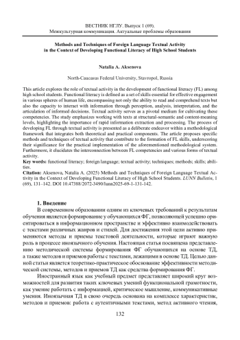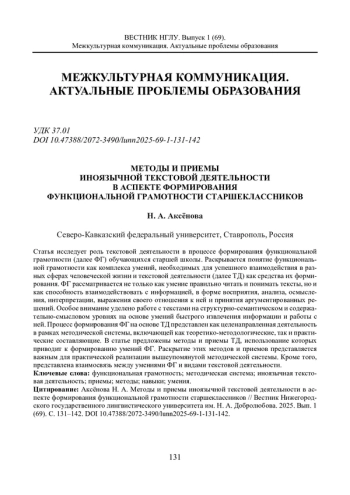 Статья исследует роль текстовой деятельности в процессе формирования функциональной грамотности (далее ФГ) обучающихся старшей школы. Раскрывается понятие функциональной грамотности как комплекса умений, необходимых для успешного взаимодействия в разных сферах человеческой жизни и текстовой деятельности (далее ТД) как средства их формирования. ФГ рассматривается не только как умение правильно читать и понимать тексты, но и как способность взаимодействовать с информацией, в форме восприятия, анализа, осмысления, интерпретации, выражения своего отношения к ней и принятия аргументированных решений. Особое внимание уделено работе с текстами на структурно-семантическом и содержательно-смысловом уровнях на основе умений быстрого извлечения информации и работы с ней. Процесс формирования ФГ на основе ТД представлен как целенаправленная деятельность в рамках методической системы, включающей как теоретико-методологические, так и практические составляющие. В статье предложены методы и приемы ТД, использование которых приводит к формированию умений ФГ. Раскрытие этих методов и приемов представляется важным для практической реализации вышеупомянутой методической системы. Кроме того, представлена взаимосвязь между умениями ФГ и видами текстовой деятельности.