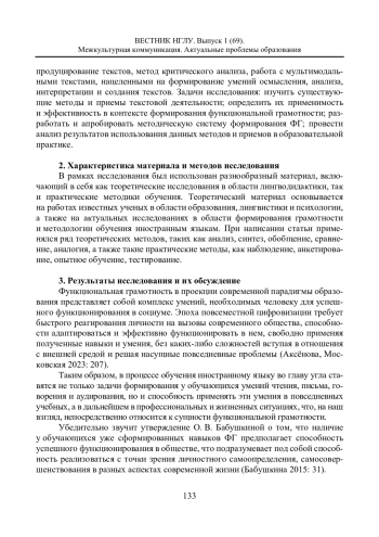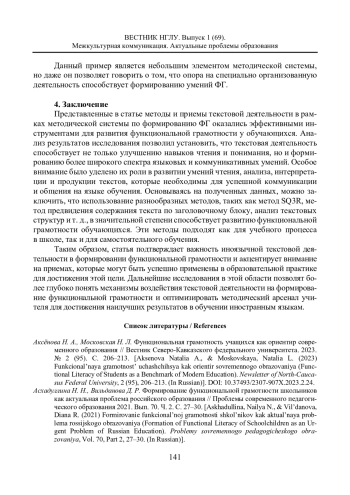 1. Аксёнова Н. А., Московская Н. Л. Функциональная грамотность учащихся как ориентир современного образования // Вестник Северо-Кавказского федерального университета. 2023. № 2 (95). С. 206-213. [Aksenova Natalia A., & Moskovskaya, Natalia L. (2023) Funkcional’naya gramotnost’ uchashchihsya kak orientir sovremennogo obrazovaniya (Functional Literacy of Students as a Benchmark of Modern Education). Newsletter of North-Caucasus Federal University, 2 (95), 206-213. (In Russian)]. DOI: 10.37493/2307-907X.2023.2.24 EDN: EPYQOA